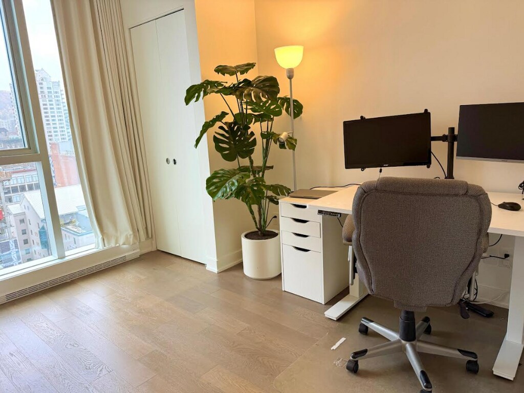 Stunning Corner Unit Condo - Bright & Located in the Heart of Downtown! Unit # 1201 Experience the Exceptional! Discover this magnificent 2-bedroom condo nestled in the vibrant core of Downtown, the ideal location for a dynamic, comfortable, and urban lifestyle. Enjoy the unparalleled privacy and brightness of this corner unit, flooded with natural light throughout the day. Key Features and Unmissable Amenities: Abundant Natural Light: Windows on two sides maximize sunlight and create a warm, inviting atmosphere. Panoramic Balcony: Relax on your spacious private balcony offering a breathtaking and majestic view of Mount Royal – the perfect spot for your morning coffee or an evening aperitif. Prime Location: Located literally in the heart of Downtown, your new home puts you close to everything Montreal has to offer. Unbeatable Accessibility: Walk just 5 minutes to access three different Metro stations, connecting you quickly to the entire city. Luxury Amenities: Enjoy direct access to a modern gym and a refreshing swimming pool for your daily well-being. Parking Included: A major asset downtown! One parking space is included for your peace of mind.