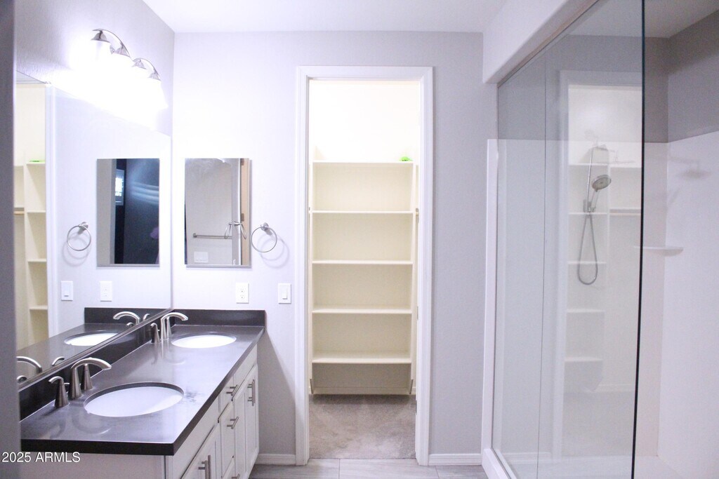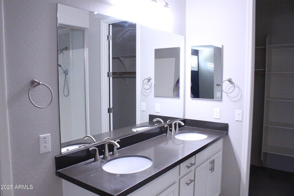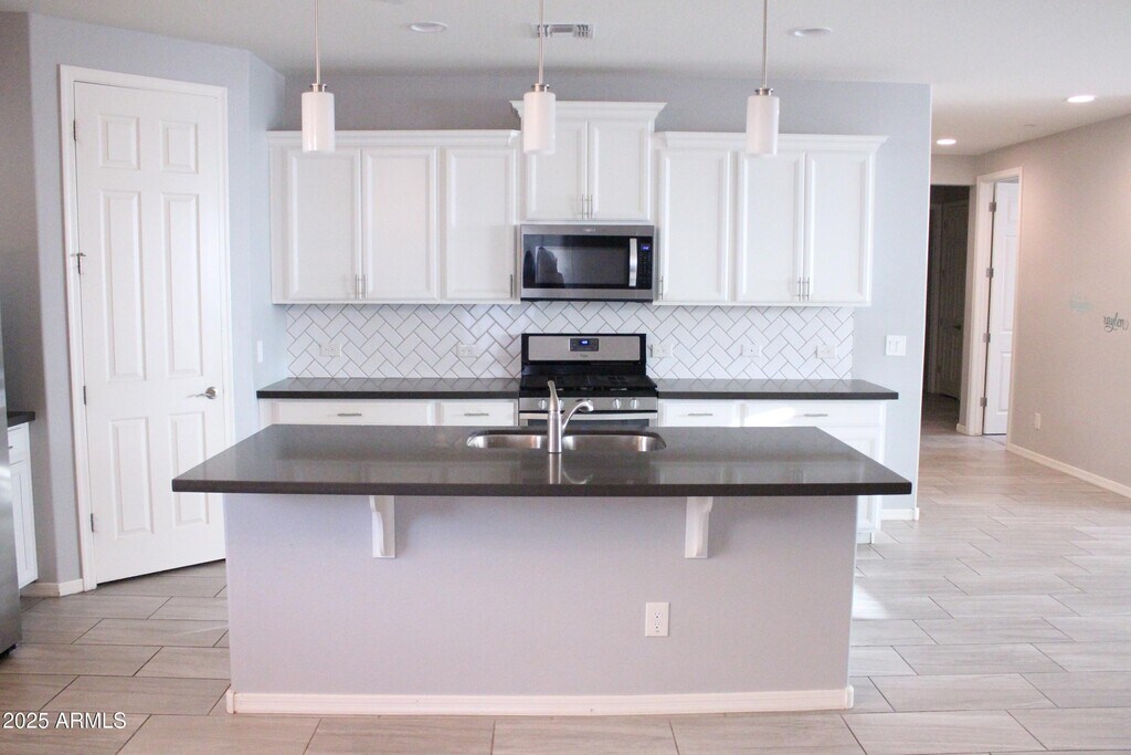 Conveniently located in beautiful Vistancia with less than 15 min driving to TSMC and the new AMCOR site. Walking distance to grocery shiping and resturants. The amazing kitchen has Gas stove,dark quartz counter tops wit herringbone backsplash that complements your white cabinets. Step into the large Master bedroom with an amazing walk in Shower with glass from top to bottom,double sinks and matching quartz counter tops. This home comes with a back yard completely landscaped with lush grass and dog run area and pavers in all the right places,this home comes with PAID OFF solar keeping your electric bills down!. Don't forget about our amazing our community amenities with 3 swim pools,great for entertaining and family time!