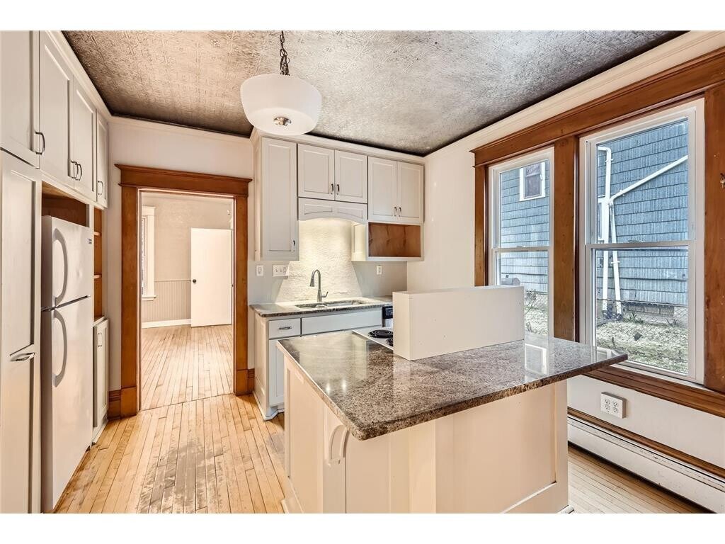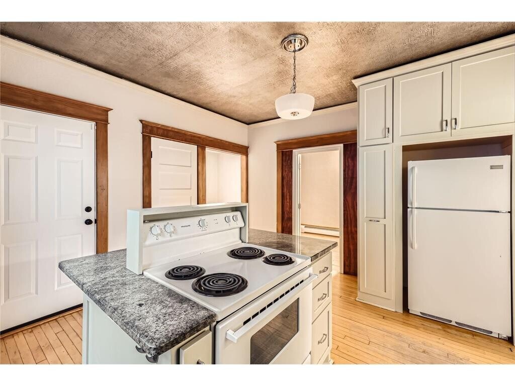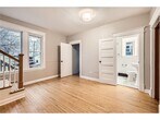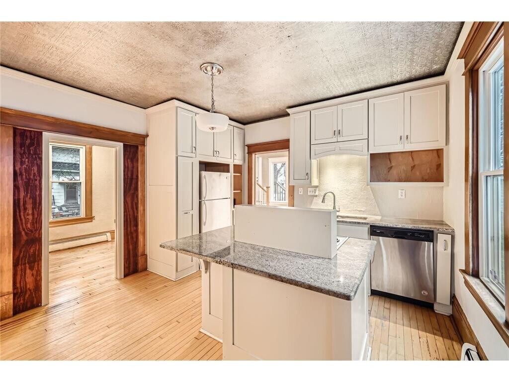 Step into this beautifully updated home featuring hardwood floors and character throughout. The open-concept kitchen boasts a stylish tin ceiling, modern cabinets, and a convenient pull-out pantry—perfect for home chefs and entertainers alike. Both bathrooms have been tastefully renovated with classic subway tile, updated vanities, elegant mirrors, and contemporary lighting. Enjoy the convenience of main floor laundry, along with energy-efficient replacement windows and new lighting fixtures throughout the home. Upstairs, you'll find a spacious bedroom with a walk-in closet and built-in shelving for easy organization. A versatile third bedroom offers the flexibility to serve as a cozy family room or a peaceful sitting area. Relax on the welcoming front porch during warm summer evenings and watch the world go by—your perfect retreat after a long day. Move-in ready and full of charm, this home is the perfect blend of comfort, style, and practicality. 6 or 18 month lease available. Tenants pay for all utilities and are responsible for lawn and snow.