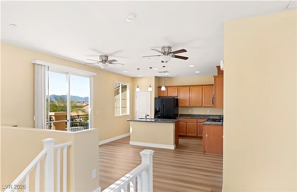 Magnificent 3 bedroom home in guard gated community that offers a pool and parks! This gorgeous home offers a spacious layout with large great room, 2 downstairs bedrooms with a separate downstairs family room, 3 bathrooms, an upstairs private primary bedroom and new luxury waterproof vinyl plank flooring along with new carpeting in the bedrooms, and a water softener. Primary bathroom includes double sinks & walk in closet. Kitchen boasts gorgeous granite counters, island, and cabinets providing plenty of storage. Balcony off kitchen/dining room with mountain views. The private backyard has a large patio and is one of the largest backyards in the community. This home is available for a Jan1st or sooner move-in.