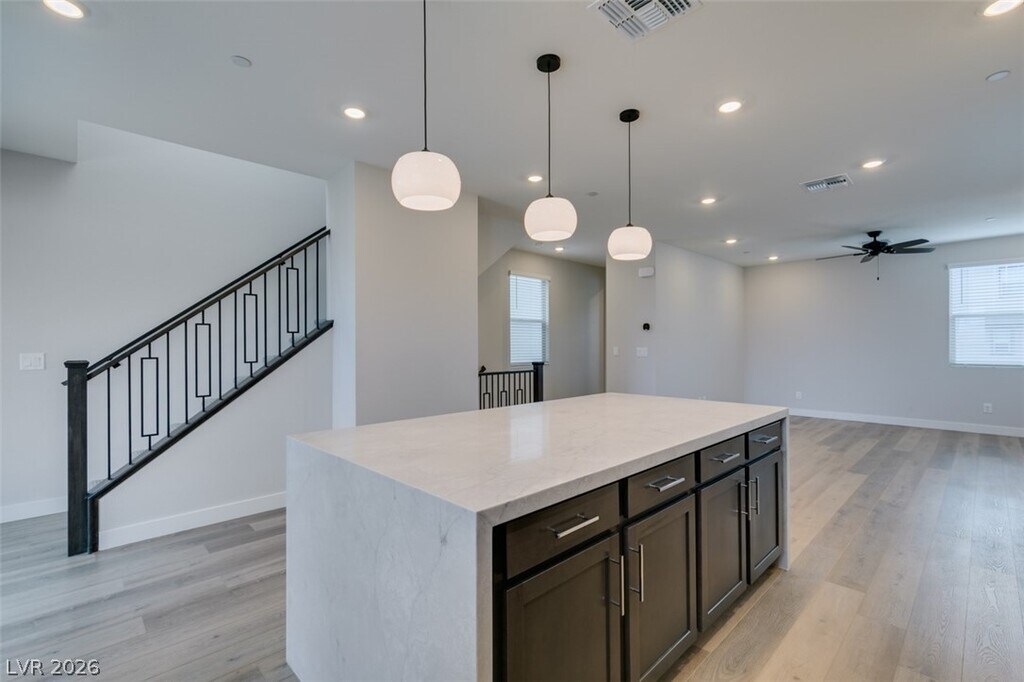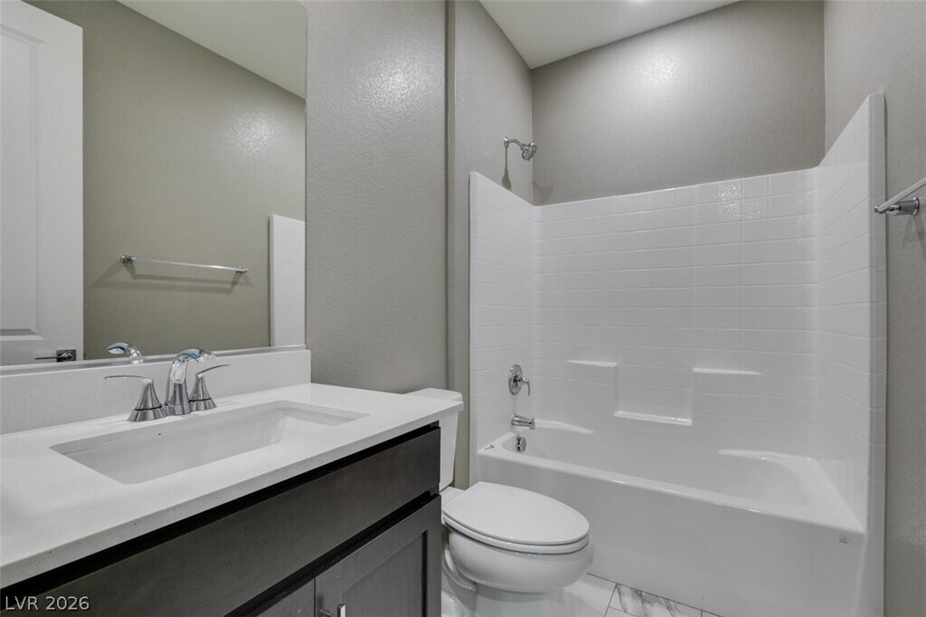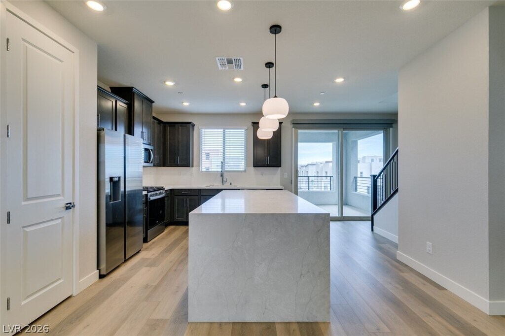 Welcome to this exquisite 3-bedroom, 3.5-bathroom brand-new home, nestled in the highly sought-after Summerlin community. With over $90,000 in premium upgrades, this residence exemplifies modern luxury and sophisticated design. Key features include 1st floor bedroom with full bath, luxury vinyl plank flooring throughout, custom tile work in bathrooms and linen areas, sleek quartz countertops with a waterfall kitchen island, gourmet kitchen with upgraded stainless steel appliances, a counter-depth refrigerator, Kohler commercial-style faucet and spacious serene bedrooms—two of which offer en-suite bathrooms. Enjoy the convenience of a stackable washer/dryer, covered patio and balcony for outdoor relaxation with breathtaking mountain and city views, a 2-car garage equipped with overhead storage racks and a full driveway. With easy access to Summerlin's parks, pools, walking trails, shopping and dining. This is a rare opportunity to live in one of Las Vegas’s most prestigious communities.