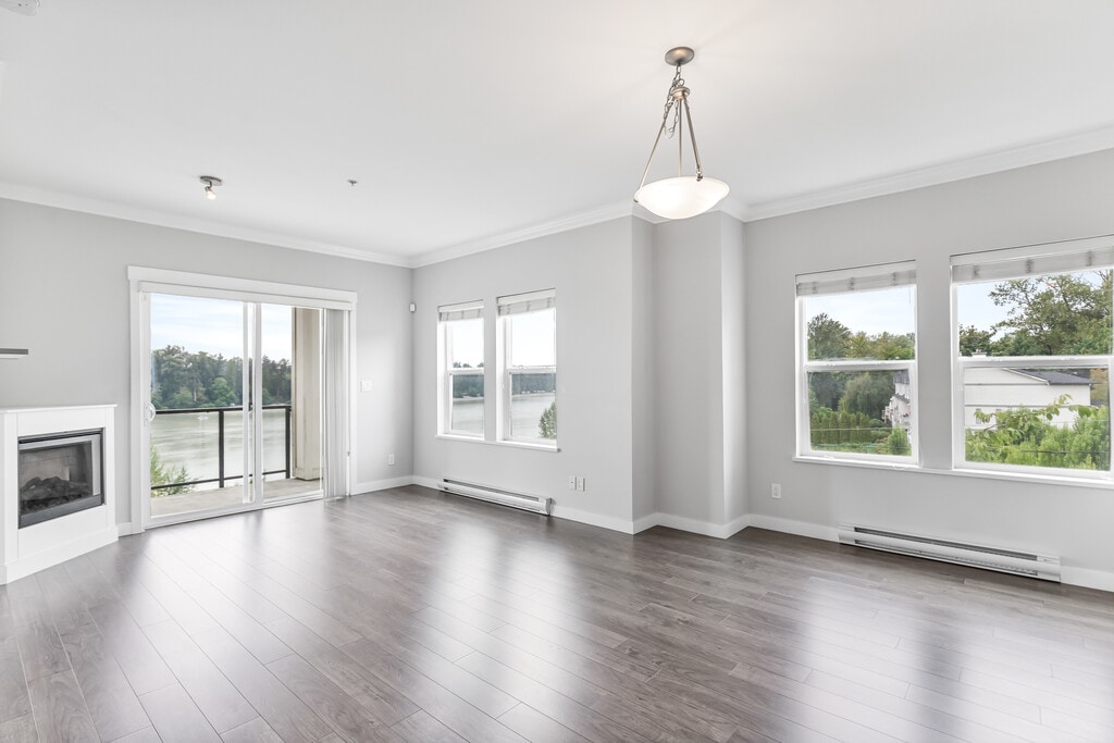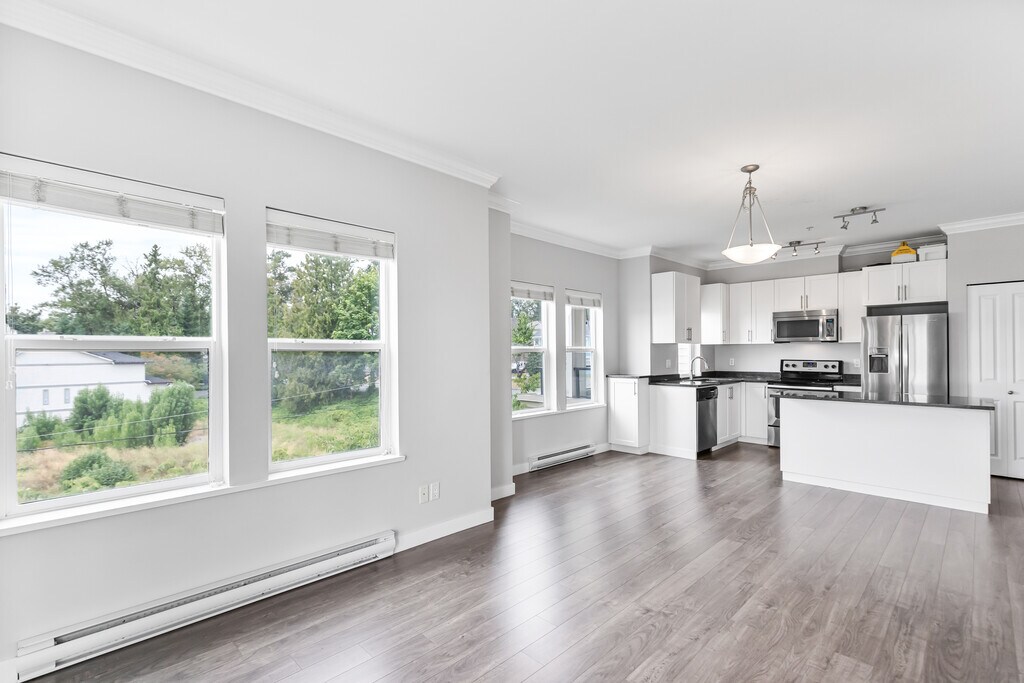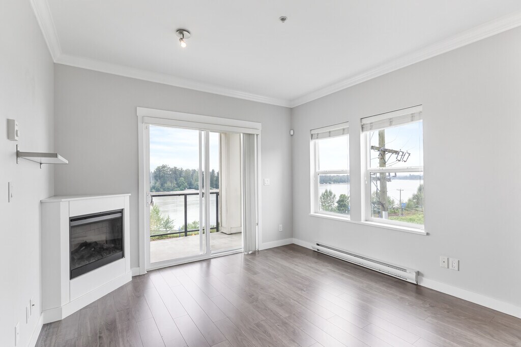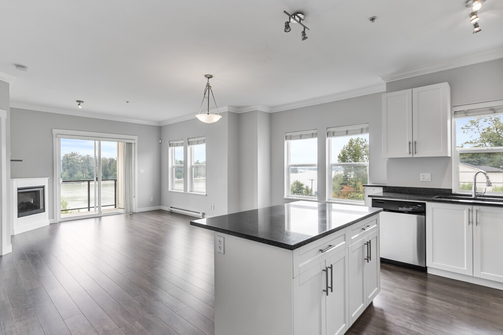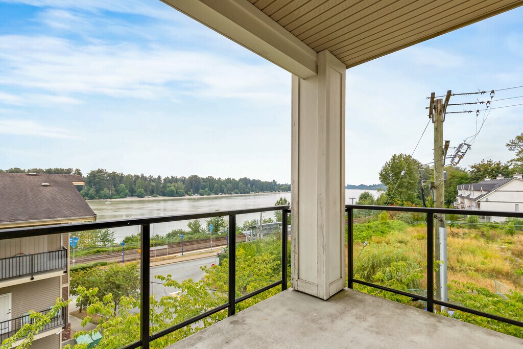Welcome to River’s Edge, where comfort meets convenience. This bright and beautifully designed 1-bedroom, 1-bathroom condo offers unobstructed views of the Fraser River and Mount Baker from a spacious covered balcony. The open-concept layout features a modern kitchen with quartz countertops, a large island, and stainless steel appliances—perfect for both cooking and entertaining. The inviting living area includes an electric fireplace and large windows that flood the space with natural light, while the primary bedroom offers dual walk-through closets leading to a 4-piece bathroom. Enjoy in-suite laundry, a secure underground parking stall, and an unbeatable location just steps from the West Coast Express, Port Haney Station, and the shops, dining, and recreation of downtown Maple Ridge.