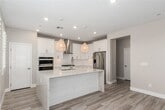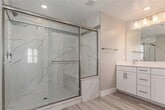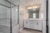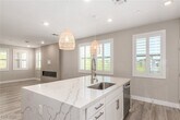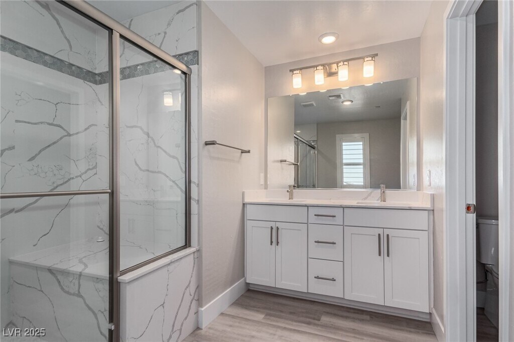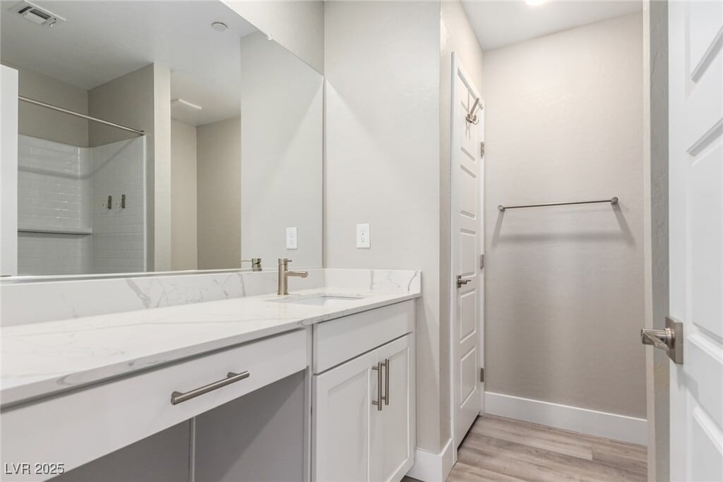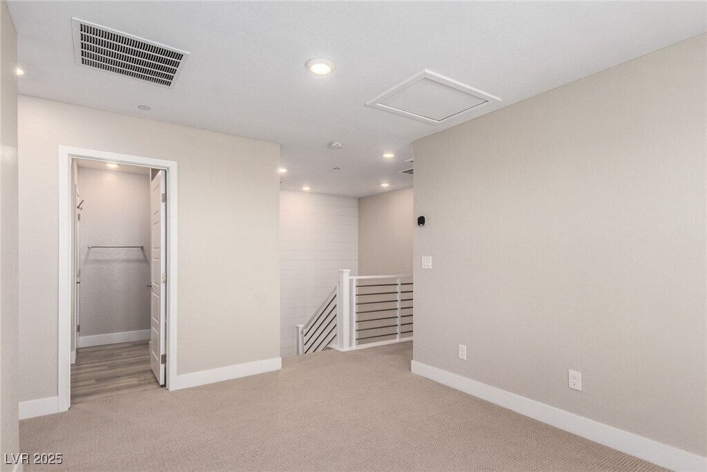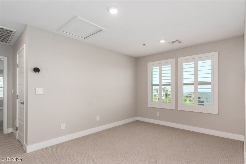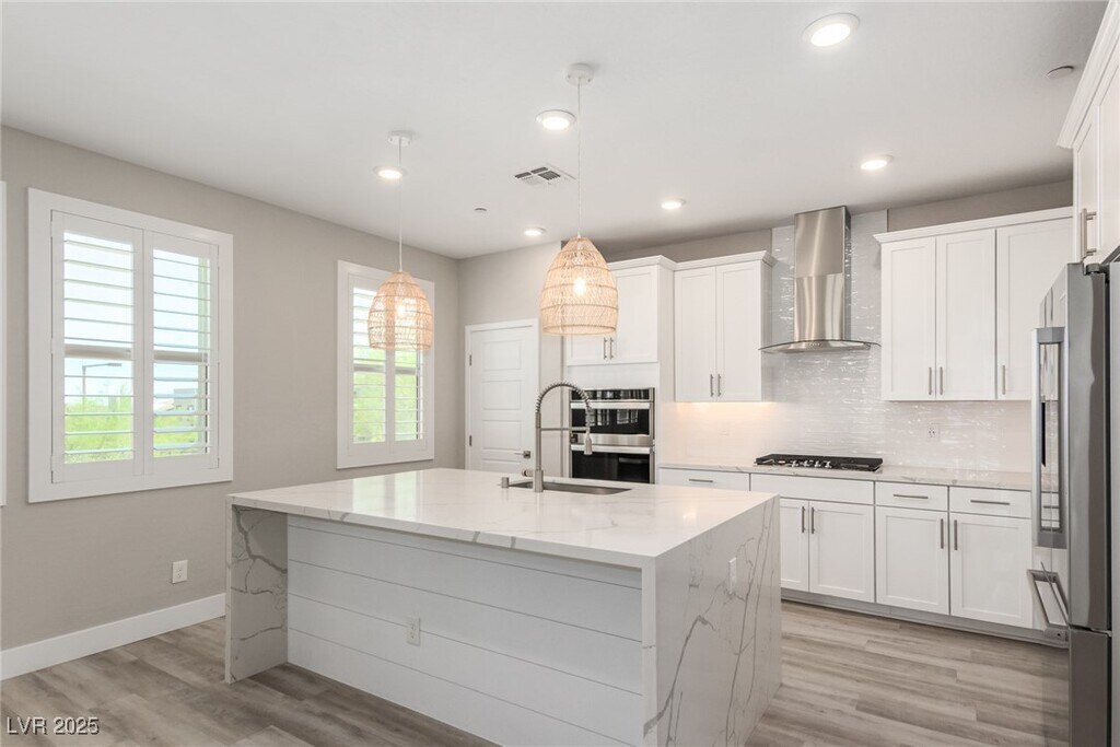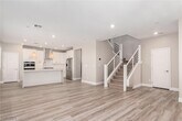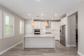 Discover this highly upgraded townhome, featuring a spacious 2-car garage and located in the desirable Summerlin area. The open floor plan seamlessly combines the kitchen, dining, and family room, creating a great room feel enhanced by an electric fireplace and stylish shutters throughout. The kitchen is a chef’s dream, boasting white cabinets, upgraded stainless steel appliances, a modern hood, white backsplash, and luxurious quartz counters with a stunning waterfall island. A powder room and laundry room complete the stylish first floor. Ascend the stairs to find a beautiful bannister, shiplap wall, and plush carpet leading to the spacious bedrooms, bathrooms, and loft. The primary suite is a true retreat with a private balcony and a spa-like bathroom, featuring a generously sized shower and a walk-in closet. Enjoy the gated entryway outside, perfect for relaxing with a cup of coffee or hosting a gathering on the cool fall evenings in Las Vegas.
