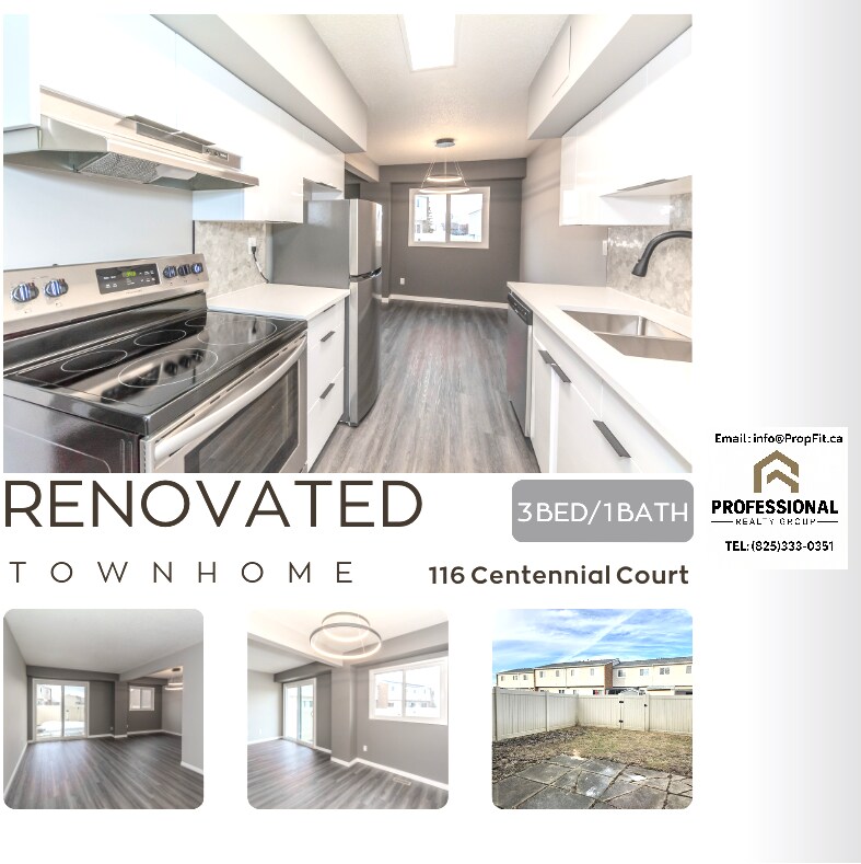 NEWLY RENOVATED 3-BEDROOM CONDO | Dishwasher | Pet Friendly | Great Location Condo - 116 Centennial Crt NW Edmonton AB T5P 4H5 • Rent: $1555 + Utilities • One small pet is welcome (extra $50 monthly pet fee applies) • One outdoor parking spot INCLUDED • 3 Beds, 1 bath • Credit, Reference and employment Check will be required with applications. • Max Occupancy: 4 People **Note: Photos are from a similar renovated unit. Finishes and layout may slightly vary.** **Move-in/out fees or Pet Fees may be required of the building board. This is out of our control. Please ask for more information. Features: 1) Enjoy an updated living space featuring modern grey tones, stylish lighting, and a sleek tile backsplash that gives the kitchen a clean, modern touch. 2) Comes complete with stainless steel appliances including a fridge, stove, dishwasher, and microwave that is perfect for preparing your favorite home-cooked meals. 3) Let your kids or small pets play safely in your fully fenced backyard, ideal for outdoor relaxation or a cozy family BBQ. 4) Your own washer and dryer are conveniently located in the unfinished basement, offering plenty of extra storage space or potential for a small rec area. 5) Durable, pet-friendly LVP flooring throughout makes cleaning a breeze while maintaining a stylish look. 6) Located in a friendly, family-oriented neighborhood with well-maintained grounds. 7) Close to schools, transit, parks, and local shops — perfect for families and working professionals. ************************************** Inquire Now!! Email: info @ propfit.ca Or CALL/TEXT (825), 333-0351 to view it today. ************************************* We Match Great Landlords with Good Tenants!! Offered by PropFit Property Management - a professional property management group licensed under the Professional Realty Group. *Advertised price reflects the discount rate for a tenant paying on or before the 1st of the month, subject to lease rules and regulations.