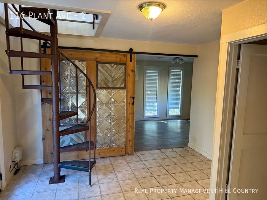 This standalone two story guest house offers privacy, space, and thoughtful design. The main floor includes a full kitchen, one bathroom, and a combined living and dining area with a flex room that can be closed off for added versatility. Upstairs, a spiral staircase leads to a private loft-style bedroom, creating a cozy retreat. Ample parking and a peaceful backyard setting make this home both convenient and inviting.