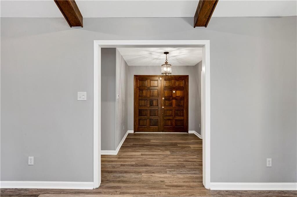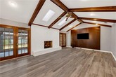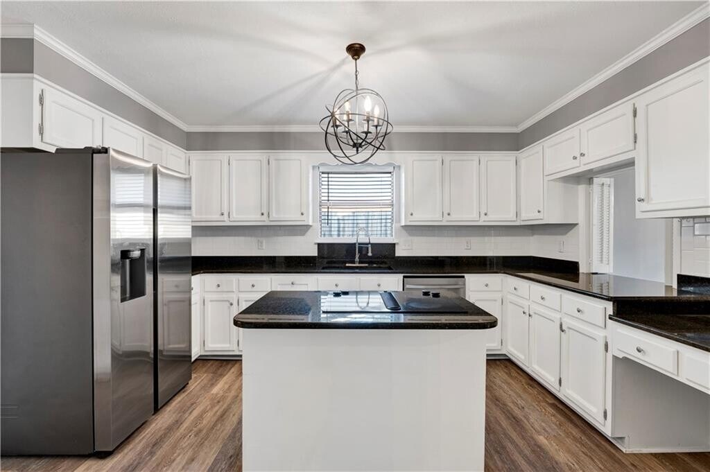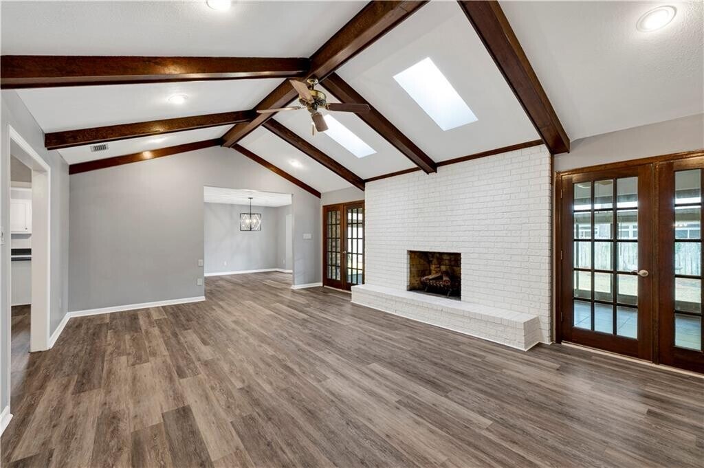 NOW AVAILABLE - Renovated - Light-Filled & Spacious! This beautifully renovated home is light,bright,and lives large,offering a distinctive modern farmhouse vibe from the moment you step into the welcoming foyer. Straight ahead,the expansive living room makes a statement with its dramatic cathedral beamed ceiling,oversized masonry wood-burning fireplace,and a custom mahogany accent wall with integrated flat-screen TV — the perfect blend of warmth and modern design. The living space flows seamlessly into a massive sunroom and formal dining room,ideal for entertaining,with a convenient pass-through to the thoughtfully updated kitchen. The kitchen is generously sized and features abundant white cabinetry,sleek black granite countertops,and updated stainless steel appliances (new oven on back-order). A center island showcases a high-end glass cooktop with a downdraft ventilation system,combining style and function. Just off the kitchen is a flexible fourth bedroom or home office,complete with a half bath,laundry closet,and direct access to the oversized two-car garage — .Down the hall from the foyer,you’ll find two spacious secondary bedrooms,both offering ample closet space,along with an oversized hall bath featuring extensive storage,a double vanity,and a tub/shower combo. The primary suite is truly impressive in scale,with a large walk-in closet and a well-appointed ensuite bath offering a double vanity and an oversized,low-step shower. French doors open directly to the expansive sunroom,creating a seamless indoor-outdoor connection and overlooking the lush,fenced backyard with side patio — an ideal retreat for relaxing or entertaining. Don’t miss the 3D True Virtual Tour to fully appreciate the layout and flow. This home offers exceptional space,style,and flexibility — all that’s missing is you.