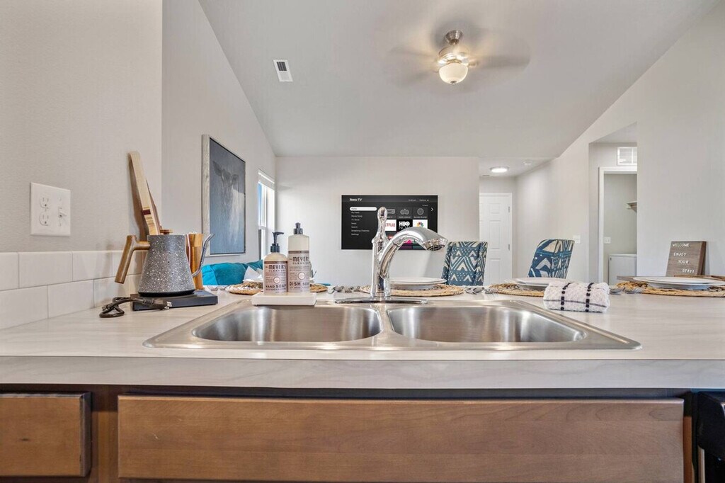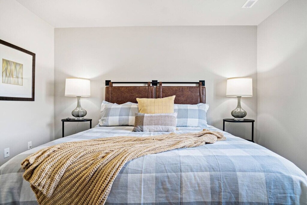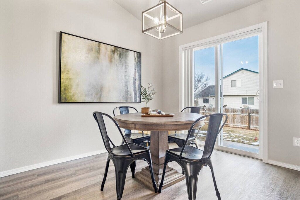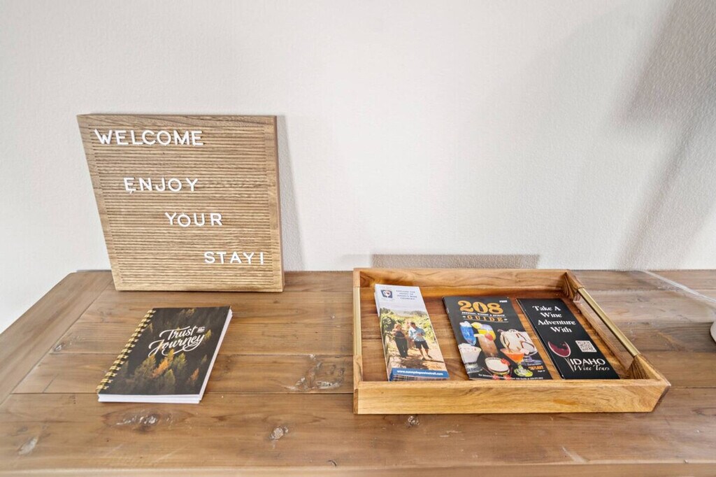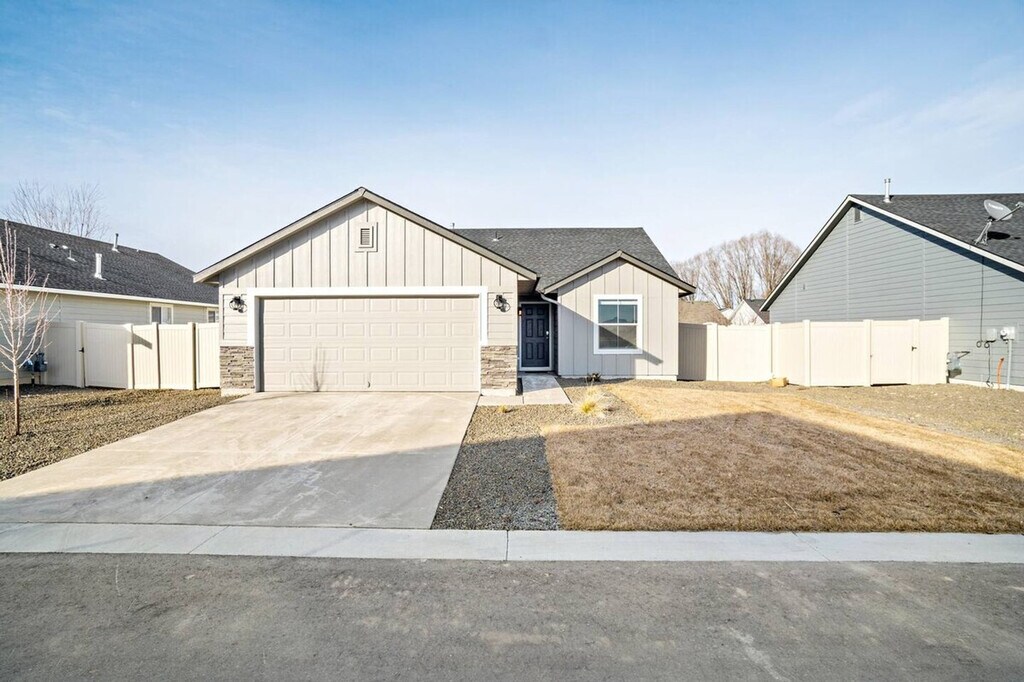 Stay in this newly built, gorgeous home in Caldwell and feel at home with its fast Wi-Fi, large TVs in the master and living room, and a fully equipped kitchen. This professionally cleaned and sanitized residence offers a spacious backyard for relaxation and is conveniently located 5 minutes from I-84 and 10 minutes from Indian Creek Plaza. The beautifully decorated space, designed by a local interior designer, features a master bedroom with a huge king-size bed, a queen-size bed, two twin-size beds, and a sofa in the main living room. The kitchen is fully equipped with appliances such as a microwave, fridge, electric stove, and dishwasher, along with glasses, mugs, dishes, and cutlery. Complimentary Wi-Fi and coffee are provided, along with a starter pack of toiletries. Secure double car garage parking is available for your convenience. This home is ideally situated for easy access to all of the Treasure Valley, being just 5 minutes from I-84. Enjoy the proximity to Indian Creek Plaza, only 10 minutes away, and a small park with a playground area on the same block. The home permits occupancy for up to 7 people. Easy self-check-in is available via a secure door keypad. Guests are welcome to use any part of the home and yard, except for two bins in the garage reserved for cleaning crew supplies, which are locked. The home is remote work-friendly with fast Wi-Fi, making it ideal for working remotely.