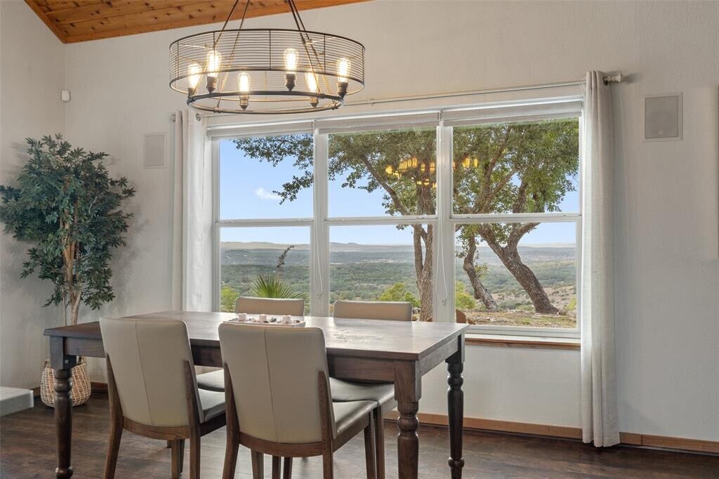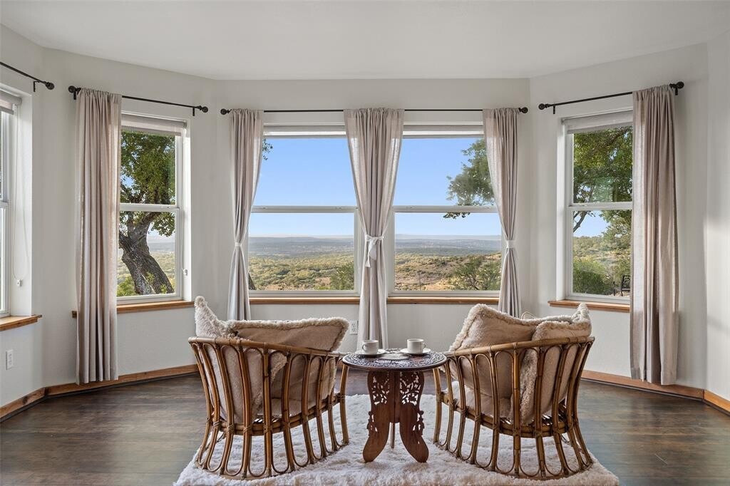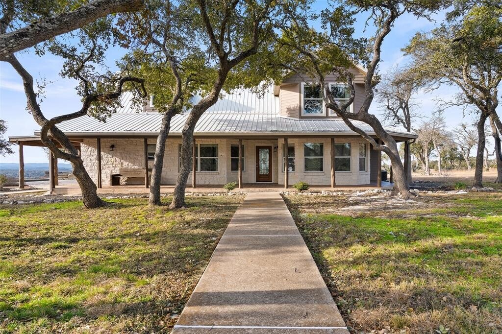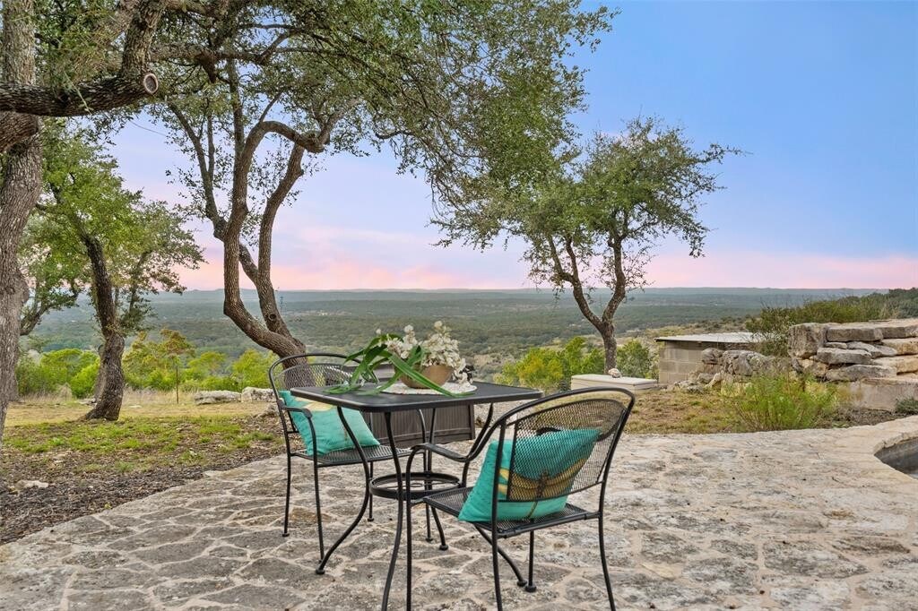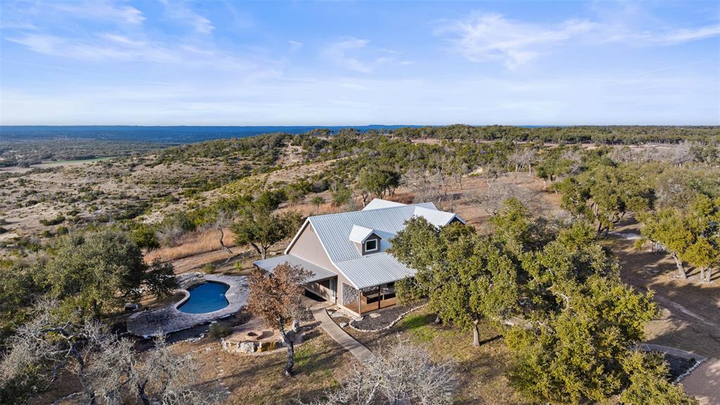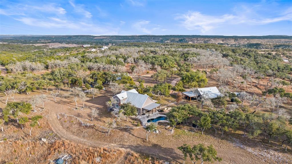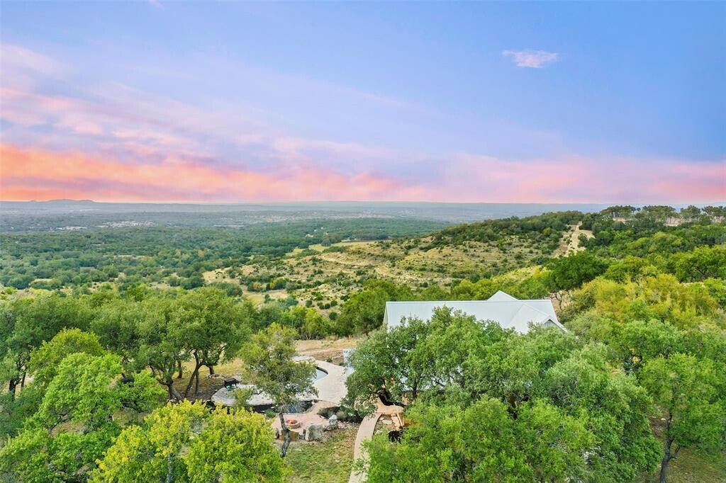 Transcendent Hill Country Views from this exceptionally private and gated 25+ acre Dripping Springs Estate in Blanco County. Comprised of an inviting 2600+ SF main home that captures the remarkable long-range vistas and rocked poolscape along with a fully appointed 520+/- guest apartment attached to the three-car garage and 1800+/- SF insulated metal building complete with heated and cooled office space. This ranchette lives much larger than its 25 acre footprint in light of the elevated and relatively flat topography but remains easy to maintain. Rainwater harvesting system in place along with a well. Studded with grand post oak trees throughout and a serene habitat for whitetail and songbirds, the land is equally as stunning as the view. A high fenced garden sits behind the guest apartment and is ready to be planted. Efficiently located near Austin and San Antonio, just 15 minutes to local shops and restaurants. Rainwater catchment and well currently in place, outside of city limits, and lightly restricted. Pets negotiable. MLS ID 4769446