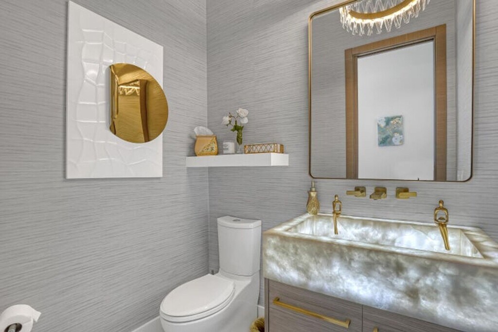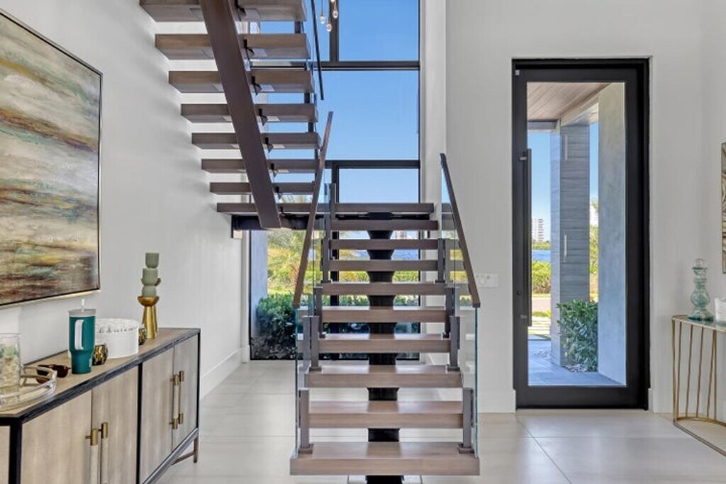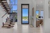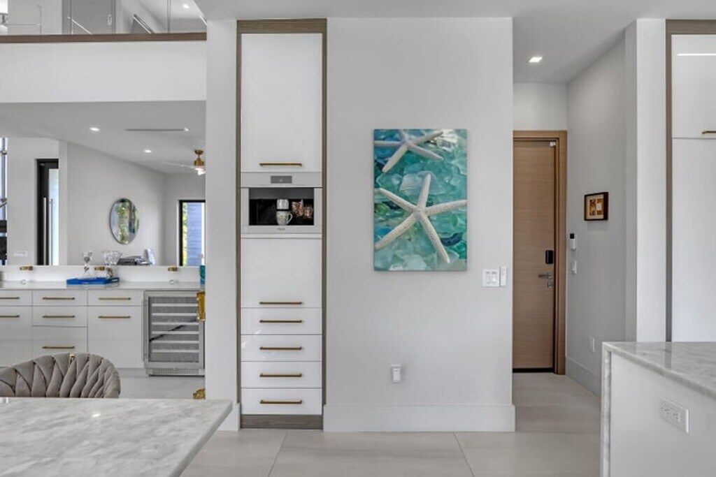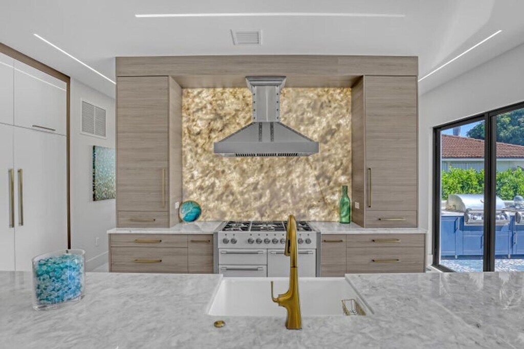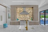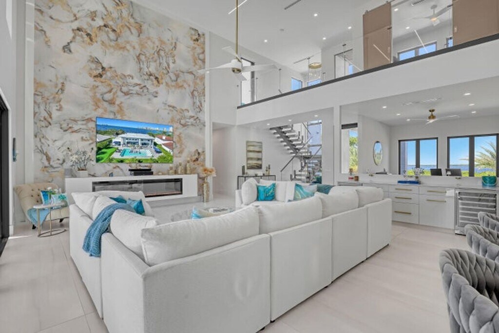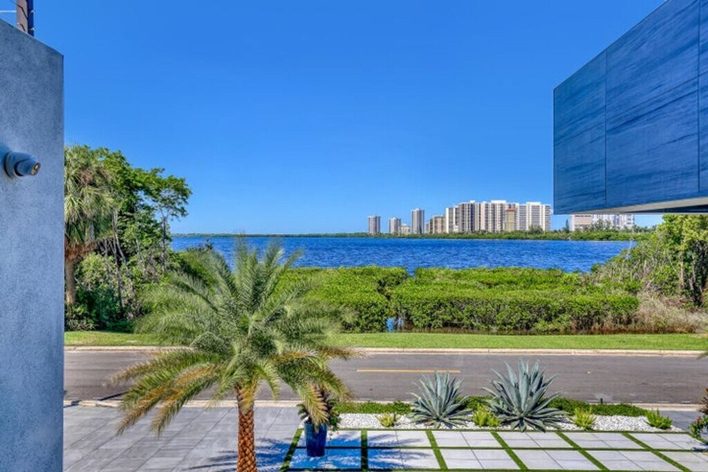 Courtesy of Florida Management & Investments LLC. Experience elevated coastal living in this stunning custom modern residence featuring breathtaking water views, sleek architectural design, and resort-style amenities throughout. This two-story home offers an open-concept layout with soaring ceilings, a designer chef's kitchen with waterfall island, custom cabinetry, and elegant finishes accented by warm modern details. Expansive floor-to-ceiling windows flood the home with natural light and seamlessly connect indoor and outdoor living. Step outside to your private resort-style backyard complete with a luxurious pool, lounging areas, and tranquil waterfront views — perfect for entertaining or relaxing in style. Enjoy sunsets from the covered balcony, offering panoramic views of the water and surrounding skyline.