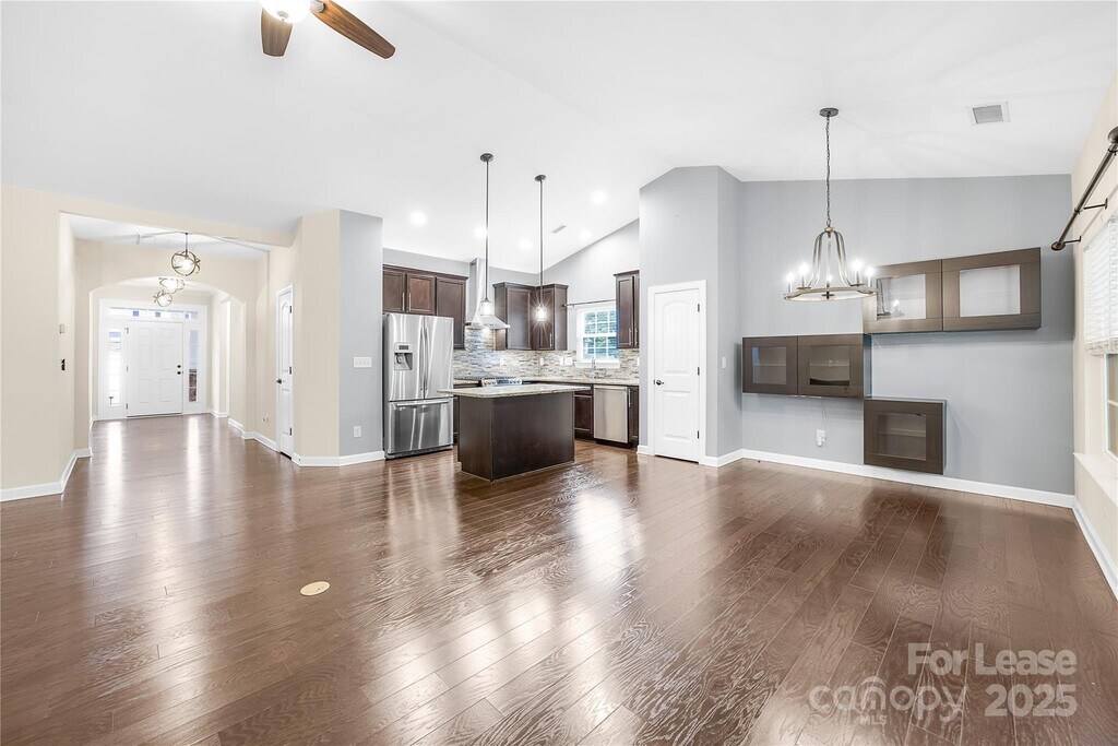 Step into this beautiful,move-in ready ranch home! Featuring an open floor plan,this three-bed,two-bath gem is brimming with upgrades throughout. From the charming rocking chair front porch,you’ll immediately feel the warm curb appeal that sets this home apart. Inside,you’ll find hardwood floors throughout the common areas,vaulted ceilings,and designer lighting that adds a touch of elegance. The thoughtfully designed kitchen boasts a tiled backsplash,stainless steel appliances,granite countertops,and a spacious island—perfect for casual dining,meal prep,and entertaining. The adjacent dining area,with its lighted wall cabinets,creates a delightful atmosphere for any occasion. The large primary suite features an en-suite bathroom with dual vanities and a big tiled shower. Outdoors,enjoy the large private,fenced yard,huge paver stone patio and space under the gazebo to relax. Washer/dryer and lawn care included. Community pool,playground plus easy access to I-77 & I-485. Pets conditional. Available Jan 1,at least 24 hour notice to schedule.