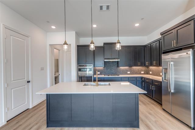 Fall in love with this beautiful NEW Ashton Woods townhome in the heart of The Farm in Allen, offering modern luxury and walkable urban living. This home showcases high-contrast finishes, gold accents, and a cool contemporary color palette. The inviting front porch opens to an airy kitchen–living–dining space with an eat-in island, stainless steel appliances, and a generous walk-in pantry. Upstairs, the primary suite features a private balcony, large walk-in closet, and spa-inspired bath with dual sinks and a walk-in shower. A spacious loft separates the primary suite from two secondary bedrooms and a full bath—ideal for privacy or flexible living. Additional highlights include a spacious 2 car garage with extra storage, energy-efficient dual-pane windows, full sprinkler system, and natural landscape. Enjoy The Farm’s vibrant lifestyle with dining, live music, movie nights, and entertainment just steps from your door—plus quick access to premium community amenities and green spaces.