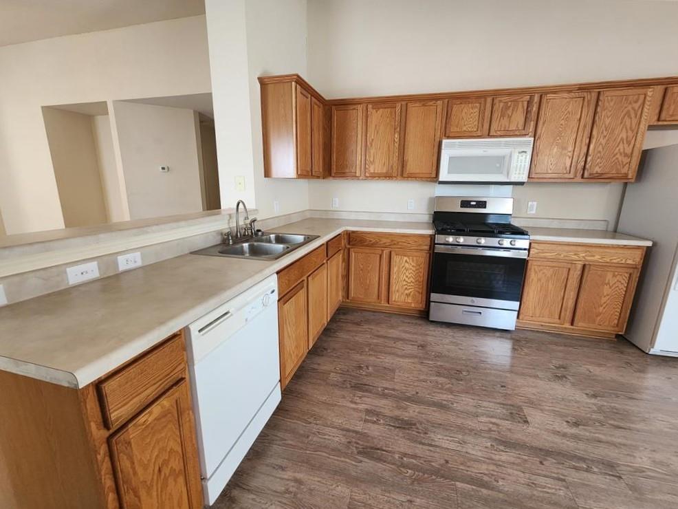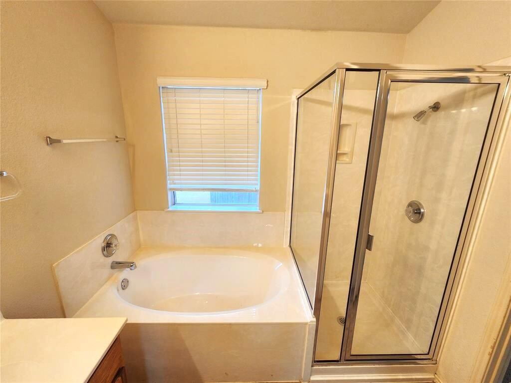 READY FOR MOVE IN! Classic 3-bedroom, 2-bath in Olympic Heights subdivision. The living room is defined by its impressive vaulted ceiling, creating an open and airy atmosphere that invites relaxation and effortless entertaining. The kitchen is thoughtfully designed, incorporating a kitchen peninsula and a kitchen bar that provide both functional workspace and a casual eat-in dining spot. Shaker cabinets offer a timeless aesthetic and ample storage. Enjoy a touch of luxury everyday - the primary bath has large walk-in closet, a shower, and separate garden tub for candlelit soaking. The laundry room adds convenience to daily living. The fenced backyard provides a private outdoor space, and the covered patio provides a perfect spot for enjoying the Texas sunshine and cooler fall nights. Olympic Heights is the type of neighborhood you always wanted to grow up in - it's a very charming atmosphere, where residents take obvious pride in maintaining their homes. Comfortable, convenient to life's necessities and great amenities like the neighborhood pool, parks, and very walkable. Come see!