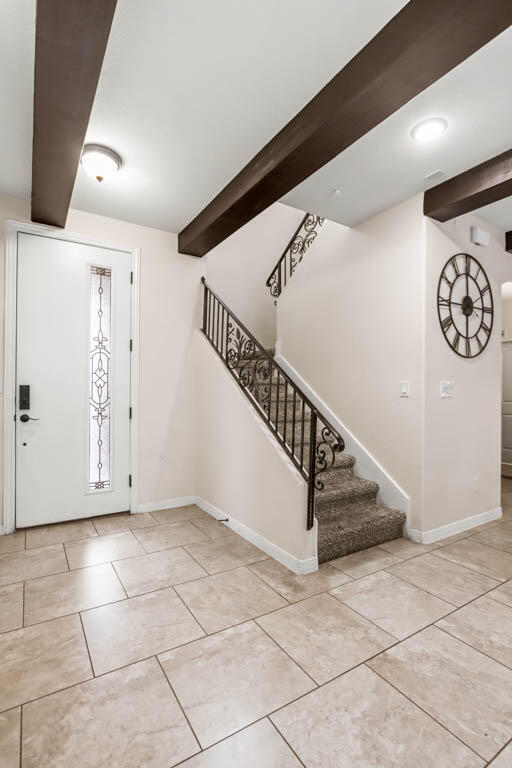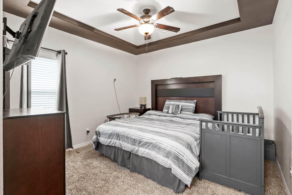 Beautiful 2 story home in gated Las Palmas condominiums. You will have access to clubhouse,fitness center,playground,swimming pool & tennis court!! Home offers 3 bedrooms & 2 1/2 baths. Tiled roof,elegant features to include crown molding,ceiling beam designs & decorative iron railing in staircase. Open floorpan,ample living room,ceramic tile on 1st floor,carpet in bedrooms. Good size kitchen with island,modern backsplash & stainless steel appliances included. Primary bedroom offers walk-in closet,dual sinks and shower area. Spacious laundry room located on first floor. Granite countertops throughout,framed mirrors in bathrooms. 2 car garage. Large private yard with artificial turf & pergola. Available until 10/01/2025.