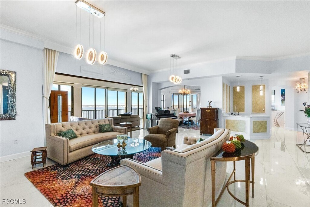 Fully furnished annual rental. 8th-floor penthouse in Palmas Del Sol at Gulf Harbour Yacht & Country Club offering approx. 4,421 sq ft. Features 3 bedrooms,3.5 baths,all ensuite,plus a spacious primary suite with private open patio. Gourmet kitchen with high-end appliances,wet bar,formal dining area,and expansive living space with panoramic Caloosahatchee River views. Enclosed lanai adds extra living area. Two-car garage under the building. Palmas Del Sol residents enjoy a private pool,spa,clubhouse,and BBQ area,with optional access to Gulf Harbour marina,golf,fitness,and dining.