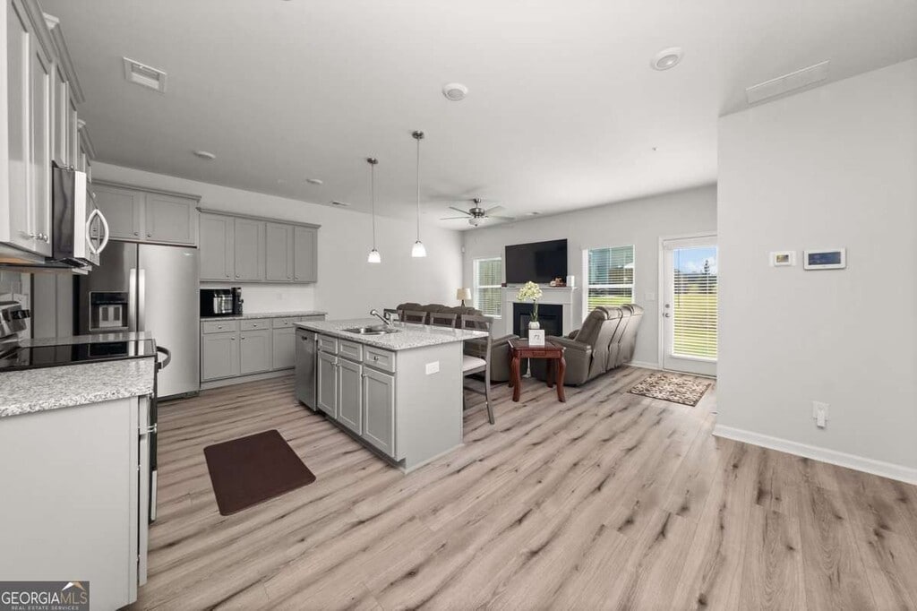 This nearly new 2-story townhome is ready for a new occupant. Main level includes wide plank hardwood floors, a spacious family room with a cozy fireplace. Chef ready kitchen with gray cabinets, granite countertops, large island stainless appliances and guest bath. The upper level features a huge primary suite with dual vanity bath and large standing shower and a generous walk-in closet. Two additional well-sized bedrooms with adjoining full hall bath and granite vanity. The property is available for 100% financing with approved credit.