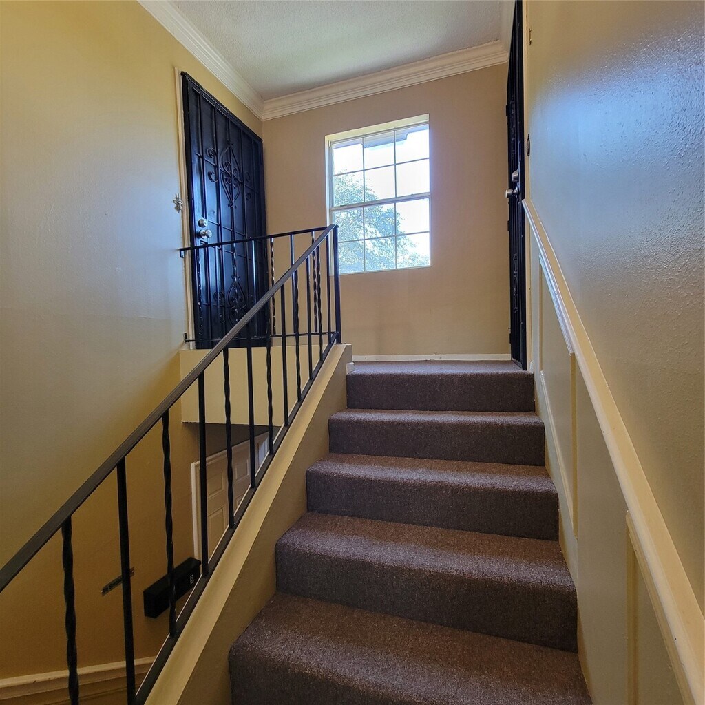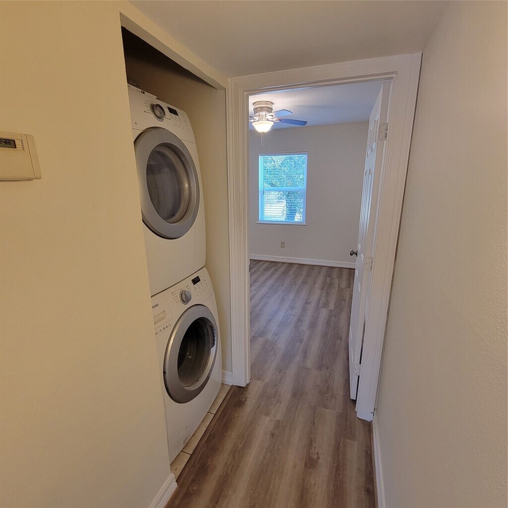Great 2 bedroom 1 bath upstairs unit. Wonderful floor plan with separated bedrooms and front and back doors. Nicely updated with recent Luxury Vinyl Plank flooring throughout,Dishwasher and Double Pane Windows and Blinds. Full appliances package including full size stacked washer and dryer. Travertine stone covered pass thru from kitchen to dining area. Covered parking just steps away out back door. Close to shopping and easy commute to Downtown,Med Center and Galleria. Convenient access to beltway 8 via hwy 90 & 610 loop. Currently zoned to Parker Elementary School a highly recognized magnet school. Sorry no pets. MLS# 54576432