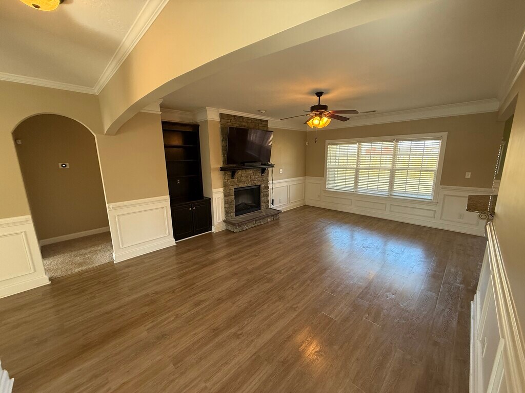 Yard Maintenance and Pool Access Included. Wonderful family home full of custom features! Dining room with extensive paneling and coffered ceilings. Stacked stone fireplace with built-ins, kitchen with copper sink, drawer dishwasher, pot filler, warming drawer, granite counters, and an island. Owner's bedroom with gorgeous ensuite bath and walk-in closet. The back yard offers lots of play space and is full privacy fence.
