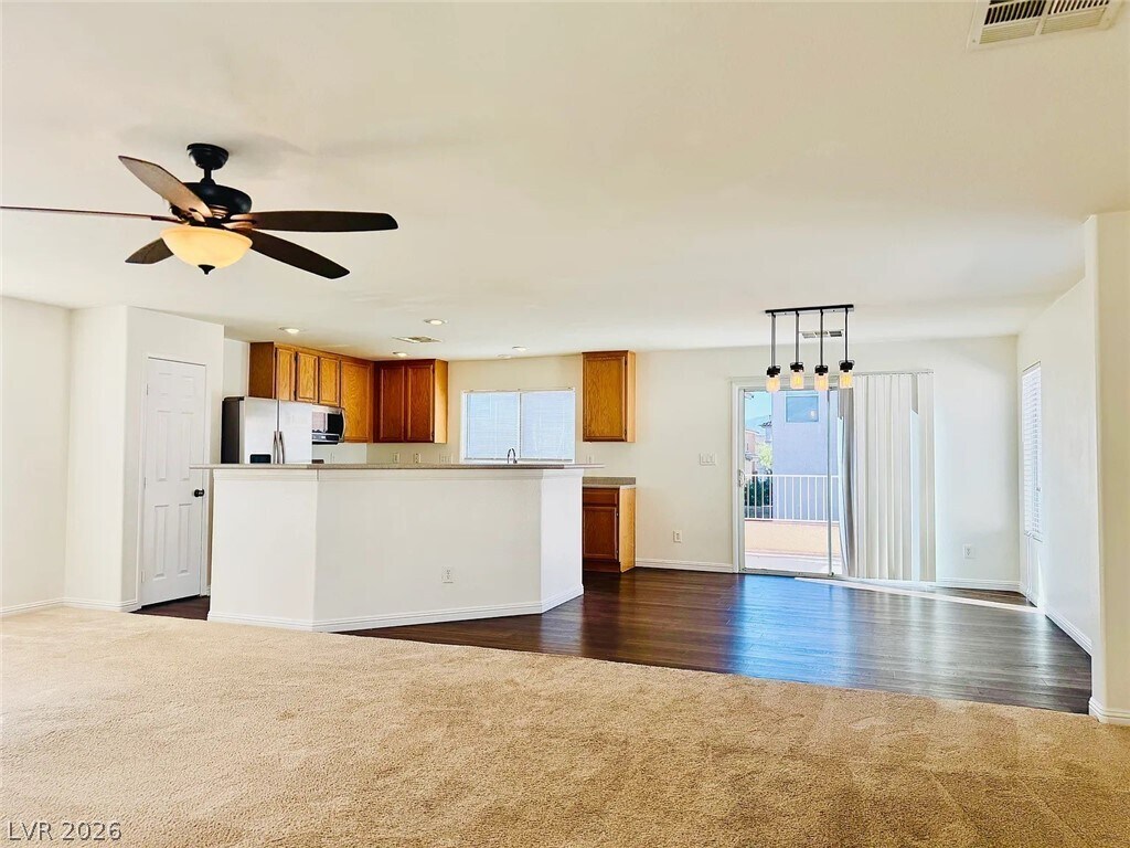 This expansive and well cared-for 4-bedroom, 2.5-bathroom single-family residence presents an outstanding opportunity in the sought-after southern end of Las Vegas. Nestled on a tranquil cul-de-sac, the property ensures a serene living experience with minimal traffic. The home boasts a light-filled, practical layout that includes inviting living and dining spaces, alongside a well-appointed kitchen featuring generous cabinet and counter space, perfect for daily use. On the upper level, the primary suite is equipped with a walk-in closet and en-suite bathroom, while the three additional bedrooms downstairs provide versatile options for family, guests, or a dedicated home office.