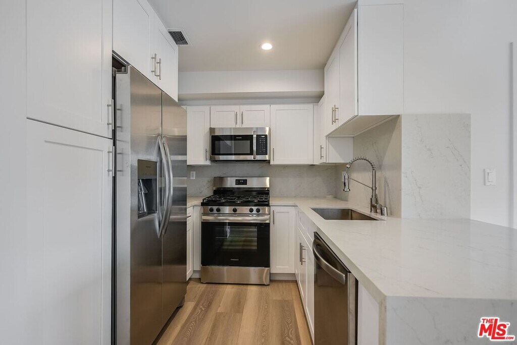 Welcome home to this ultra luxurious apartment home located near all the best that Brentwood has to offer! This bright and newly updated, premier penthouse 2 bedroom, 2 bath apartment has all the modern amenities featuring vaulted ceilings, a gorgeous, chef's kitchen with quartz waterfall countertop and backsplash, high-end stainless-steel appliances, and custom cabinets with custom hardware. Each bedroom features, high-ceilings, an en-suite bathroom and ample closet space. The newly remodeled bathrooms are spacious and stylish. In addition to the sleek design, these stunning apartment homes feature, luxury flooring throughout, recessed lighting and convenient in-unit laundry and extra closet space. Enjoy our wonderful California weather on your spacious private balcony. This unit comes with two gated parking spaces. With amazing restaurants, cafes, stylish shops, and grocery stores, everything is literally around the corner or just minutes away from your new home. Live your best you at Darlington Place. Centrally located near Westwood, Beverly Hills and everything the Westside has to offer. Some virtual staging photos may not be of actual unit. MLS# 25621889