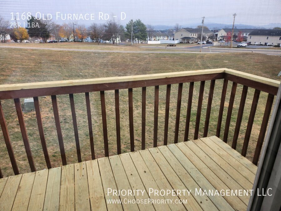 1168Old Furnace Rd Unit D at Lexington Square Apartments 2nd Floor 2BR 1BA apartment with deck - Open floor plan - Washer and Dryer included Central heat and air condition. Gas heat and hot water. No utilities included in rent. No smoking in units or in stairwells. Only 2 cars allowed per unit - marked spaces. Cats considered. $300 pet deposit and $50 monthly pet rent. All Priority Property Management residents are enrolled in the Resident Benefits Package (RBP) for $20.95/month which includes renters insurance, HVAC air filter delivery (for applicable properties) and much more! More details upon application. *If you are visiting a 3rd party listing site please visit to ensure this property is still available. ***New Porticos are under construction - should be finished within 30 days*** If you decide to apply for one of our properties, there is a $50 per adult application fee(non-refundable). Anyone 18 and older who will reside at the home MUST apply. We WILL (1) review applicant credit history; (2) screen for any past evictions; (3) verify income sources; (4) verify previous landlord references; and (5) perform criminal background screening. Please see our direct listings at for ALL screening criteria.