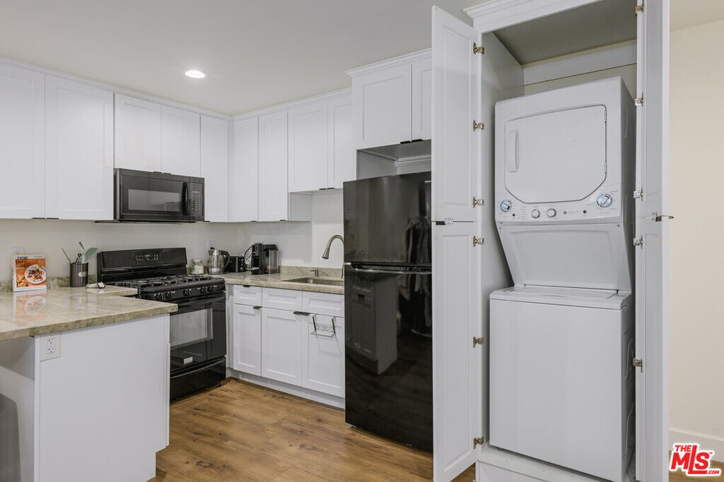 Move-in ready studio in a well-kept multifamily building near the NoHo Arts District. Open layout with recessed lighting, durable plank floors, dual-pane windows, and A/C & heat unit. Equipped with shaker cabinets, granite-style counters, gas range, microwave, dishwasher, full-size fridge, and a peninsula for casual dining. Stacked in-unit washer/dryer is neatly built in. Updated bath with modern vanity and glass-enclosed shower. Enjoy the gated courtyard patio, perfect for morning coffee and shared access to a sparkling pool with lounge areas. Convenient street parking and easy access to dining, shopping, freeways, and Metro. MLS# 25611275