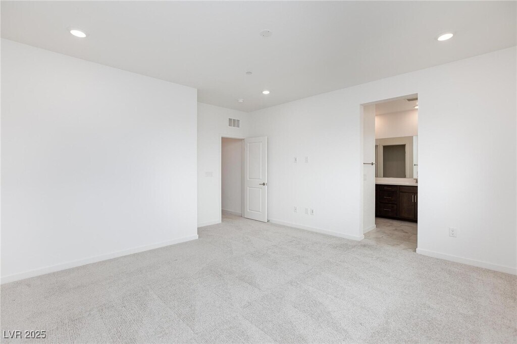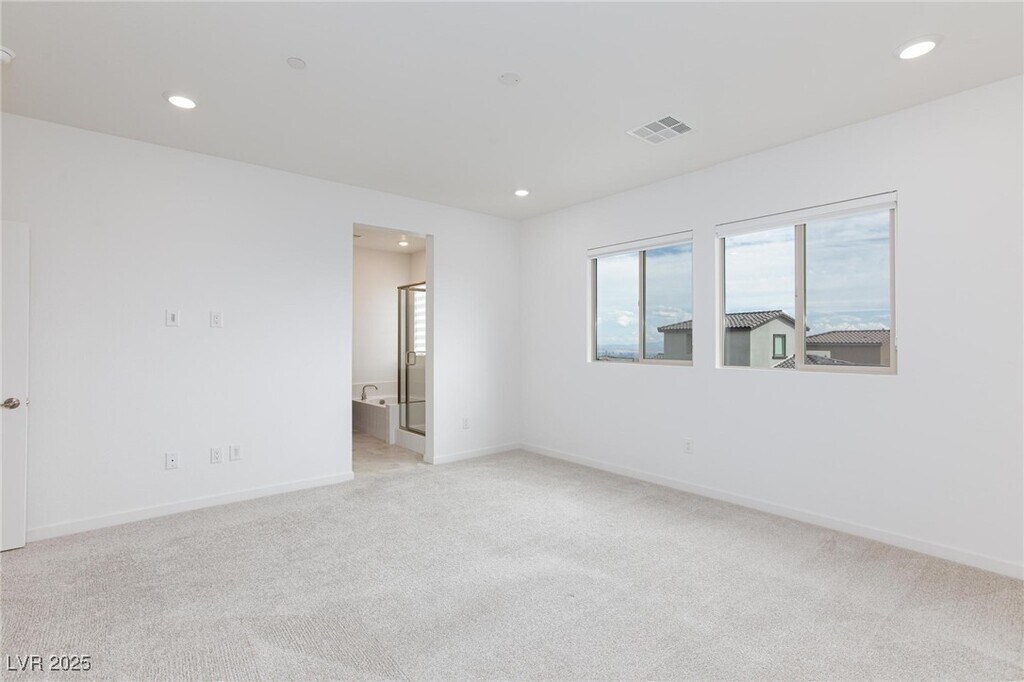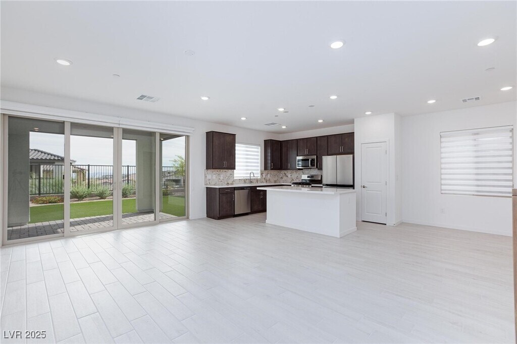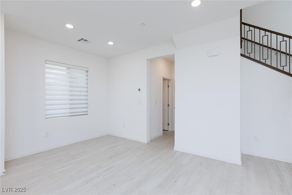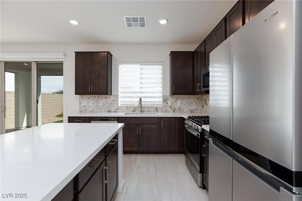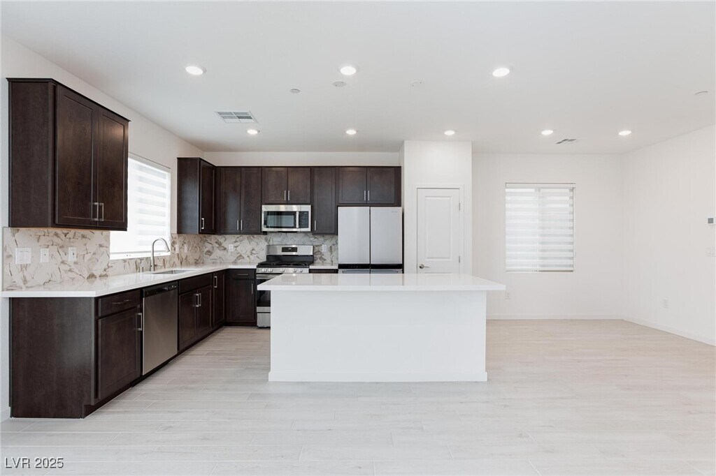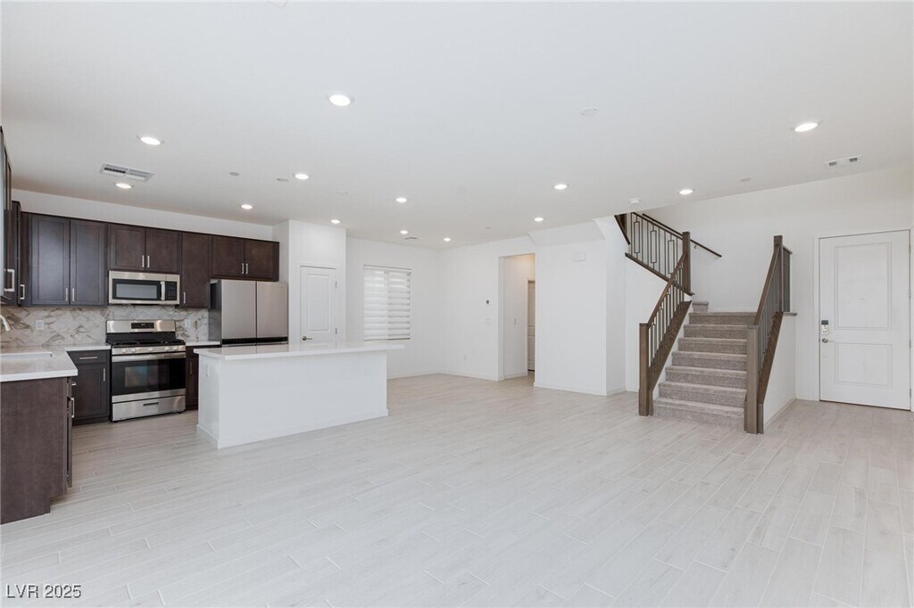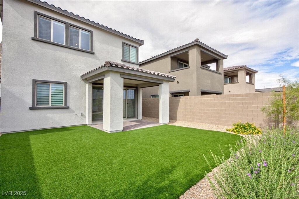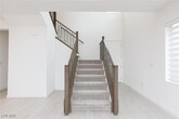 Welcome to this beautifully maintained home in the vibrant city of Las Vegas, NV. This residence features a modern kitchen with 42-inch cabinets, stainless steel appliances, and a 12-foot center-meet sliding glass door that opens to the backyard, creating a bright and open living space. The finished garage includes a keyless entry pad for added convenience. Upstairs, you’ll find three bedrooms, including a spacious primary suite with a walk-in shower and abundant natural light. The open floor plan is perfect for entertaining, complemented by upgraded cabinet pulls and ceiling fan prewires throughout. Additional highlights include a BBQ gas stub, electronic front door lock, and Ring doorbell for comfort and security. Enjoy easy backyard maintenance with a fully landscaped, spacious yard, ideal for relaxing or entertaining. This well-cared-for home offers modern features, comfort, and functionality in a great location. Don’t miss the opportunity to make this wonderful home yours.