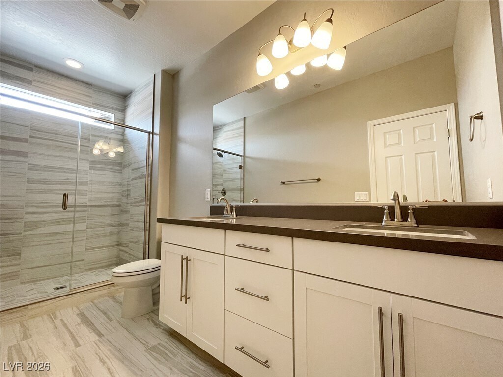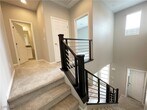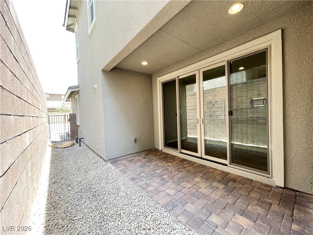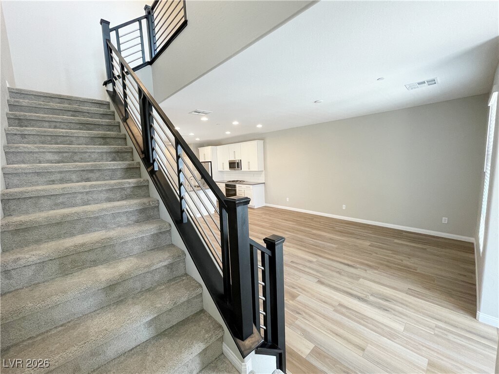 Newer modern 3-bedroom townhome in Summerlin, built in 2022, featuring a 2-car garage and an open-concept floorplan. Durable wood-look laminate plank flooring highlights the downstairs, with carpeted bedrooms upstairs for added comfort. The kitchen offers a breakfast bar island, recessed lighting, and stainless steel appliances, ideal for everyday living and entertaining. The primary suite includes a walk-in closet and a private bath with dual sinks and a walk-in shower. Sliding glass doors open to a patio backyard. Conveniently located near freeway access and premier shopping and dining at Downtown Summerlin.