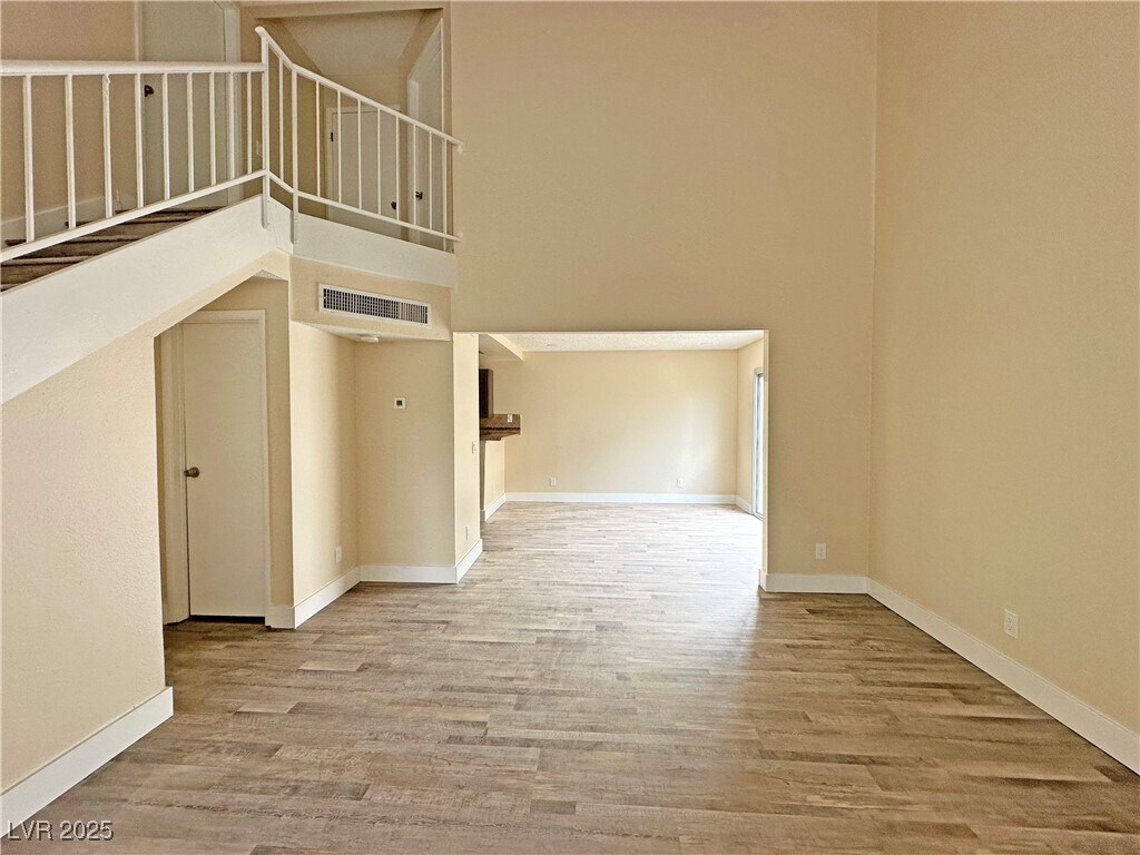 Amazing two-story townhome with two bedrooms, and two and one-half bathrooms in Henderson! Welcome into the home with a vaulted ceiling, lovely vinyl plank flooring running throughout the home, two-tone paint, and ceiling fans. Great layout with a spacious family room at entry and ahead is the dining area that opens to the kitchen. There is a sliding glass door off the dining area leading out to the patio. The beautiful galley-style kitchen is elevated with granite countertops, a stunning backsplash, stainless steel appliances, upgraded sink, and a breakfast bar. The bedrooms are upstairs and the generously sized primary suite has a walk-in closet and an attached bathroom equipped with a walk-in shower. The secondary bedroom has an attached bathroom providing a tub and shower combination. The private outdoor space is enclosed with a block wall and features a patio.