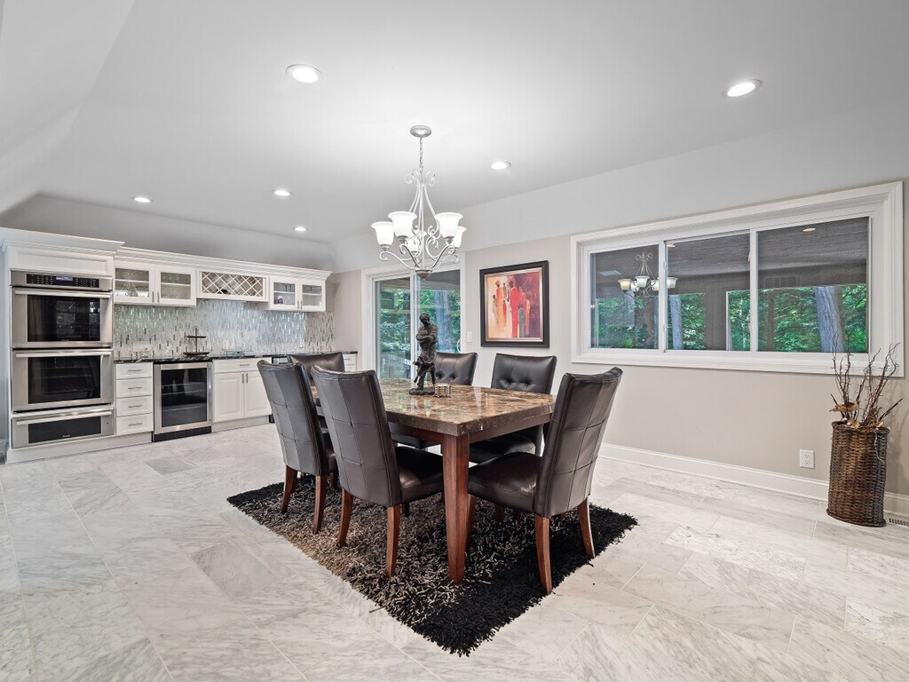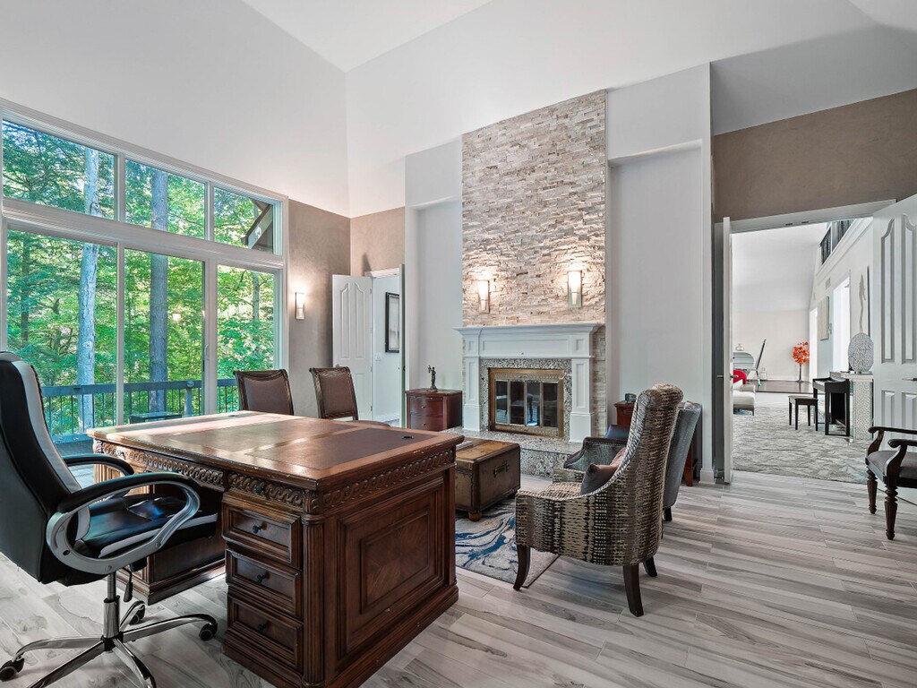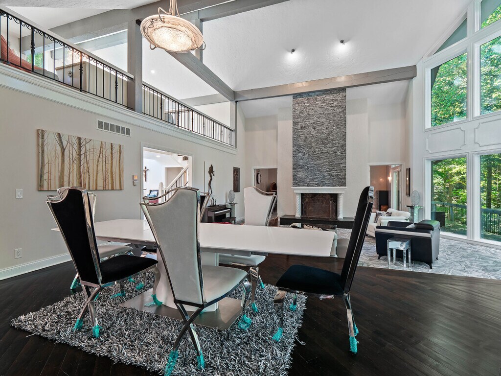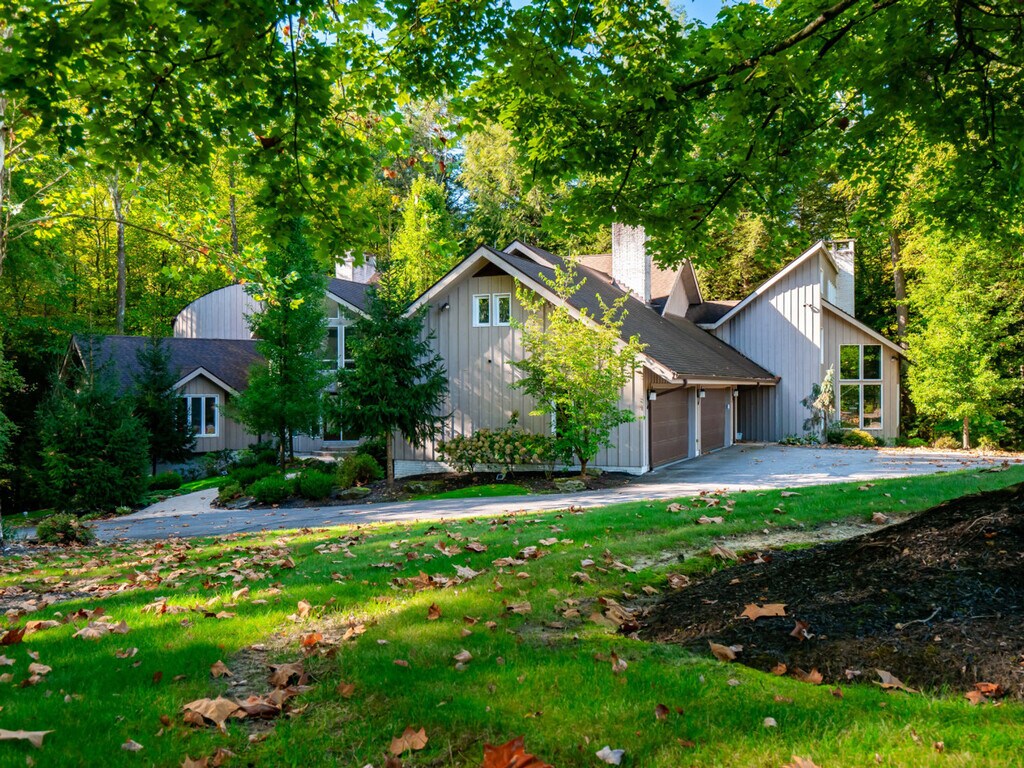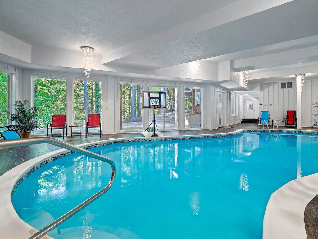 Feel at home in this extraordinary 5-bedroom luxury retreat, where comfort, privacy, and resort-style amenities come together for an unforgettable stay. Nestled on a secluded wooded lot, this spacious home is designed for both relaxation and entertainment. This home features an indoor heated pool, sauna, home theater, workout space, and multiple inviting gathering areas perfect for every season. The gourmet kitchen is a chef’s dream with a large island, double ovens, bar area with wine and beer fridges, and plenty of counter space for preparing and sharing meals. There is a dining area for six adjacent to the kitchen, and a dining space for up to six in the family room. The main-floor master suite offers a true retreat, complete with a king bed, spa-inspired bathroom, walk-in steam shower, and soaking tub. On the lower level you'll find the indoor heated pool, complete with depths of up to 10 feet, a sauna, a full bathroom with walk-in shower, and a home movie theater with seating for nine. The walk-out basement includes a bar room with seating around a brick fireplace, a dedicated workout area, and access to a large patio that opens onto the private backyard. Up above, the spacious deck offers additional seating and wooded views. Ideally located, this home is complete with an open family room featuring soaring ceilings, a two-story decorative stone fireplace, and cozy seating that overlooks the private deck and backyard. Off of the family room is a large office with a spiral staircase leading to a charming observatory, a hidden gem with panoramic views and a cozy nook ideal for reading or unwinding. The hearth room/family room provides an intimate seating area with another decorative fireplace with a TV above. Upstairs, you’ll find four additional bedrooms—three with king beds, one with a queen, and one with a full. Bedroom 2 is accessible via a spiral staircase from the hearth room or from the main entry hall, featuring a king bed and private bathroom with tub/shower combo. Bedroom 3 includes a king bed, TV, and deck access, and connects to Bedroom 4, which features a full bed (Bedroom 4 is only accessed through Bedroom 3). Bedroom 5 offers a queen bed, private deck, and en-suite bathroom with a tub/shower combo. Please keep noise to a minimum when outside. Quiet hours are from 10 PM to 8 AM. Excessive noise may result in a $500 fine due to past neighbor complaints. Smoking inside the house is prohibited and will result in a $500 fine. Strictly no pets are allowed. If the property is equipped with a grill, guests are responsible for refilling the propane tank if needed and will be reimbursed with a receipt. Please remove shoes indoors to help keep the home clean.