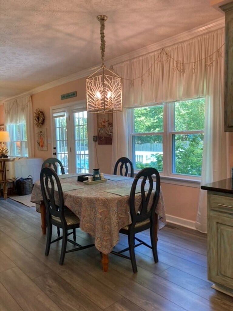 Four-bedroom home with all wood floors downstairs and carpet upstairs. Kitchen comes with refrigerator, stove, microwave, and dishwasher. Washer and dry included. Formal living room and dining room. Eat in kitchen. Large deck off back of house. Storage shed in back of property. Two car garage. Home has been renovated.