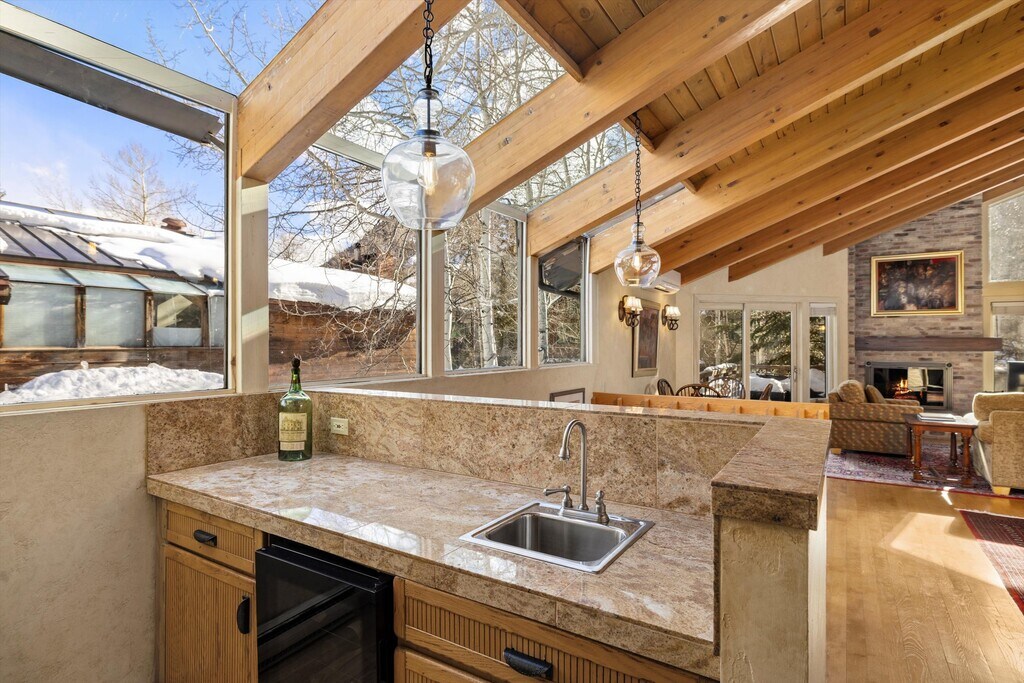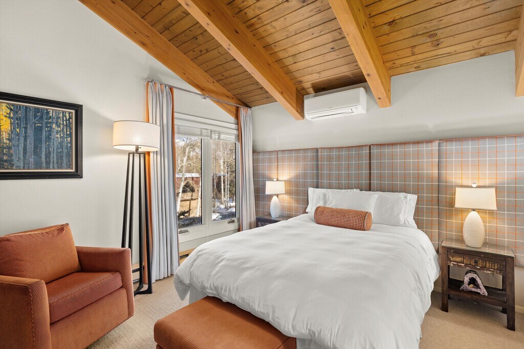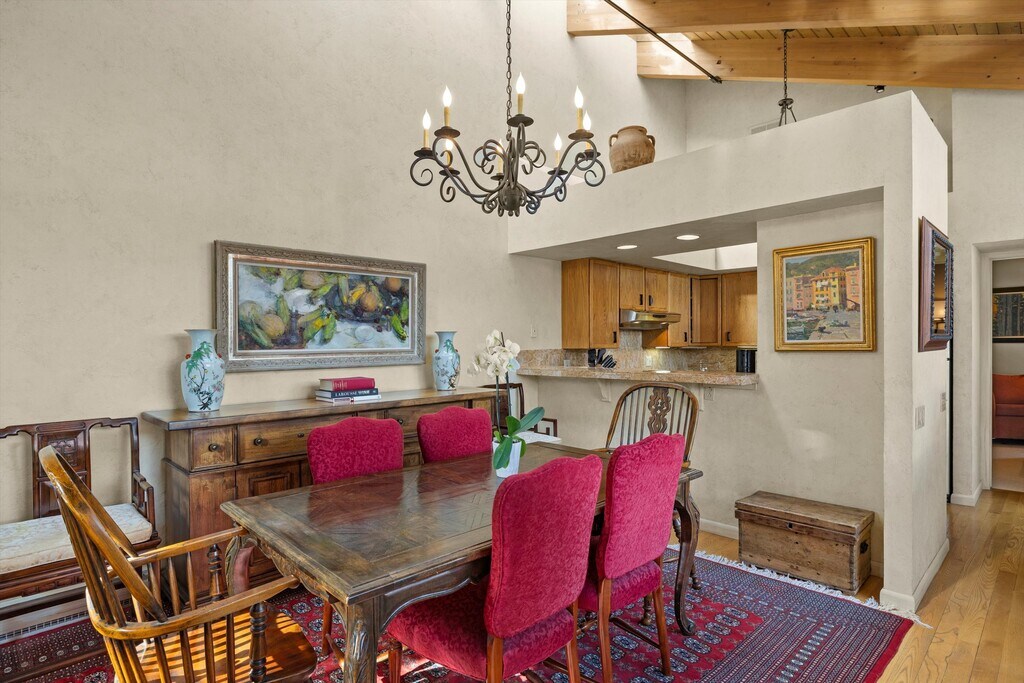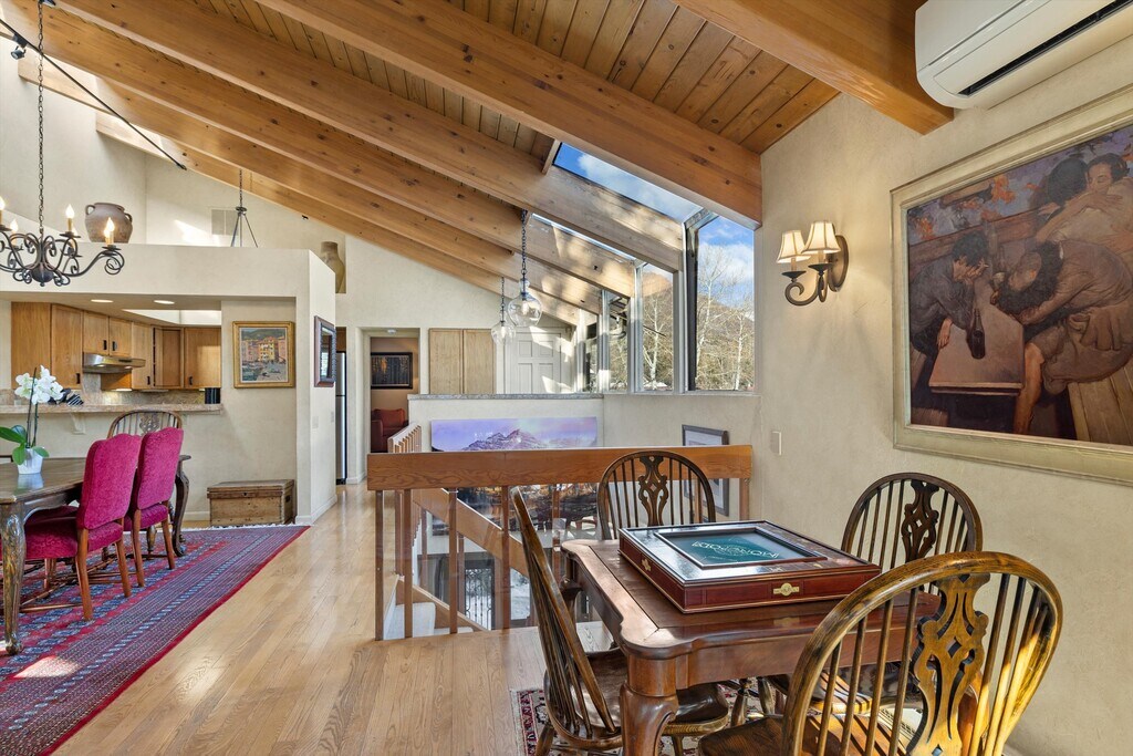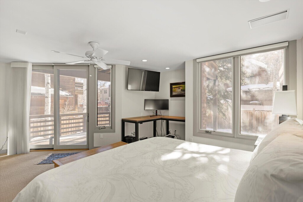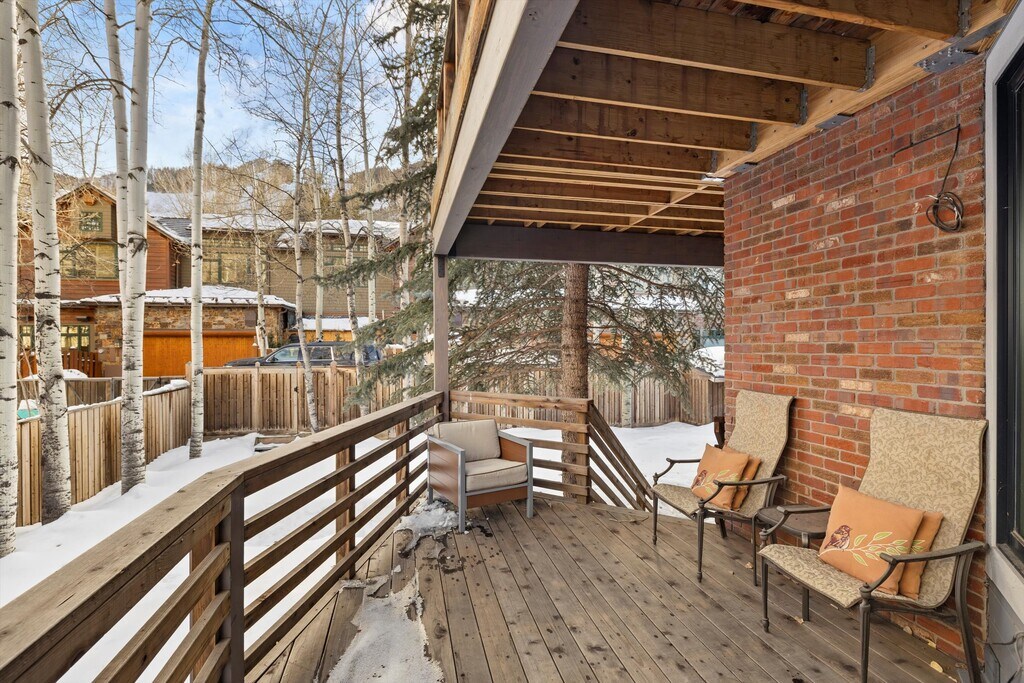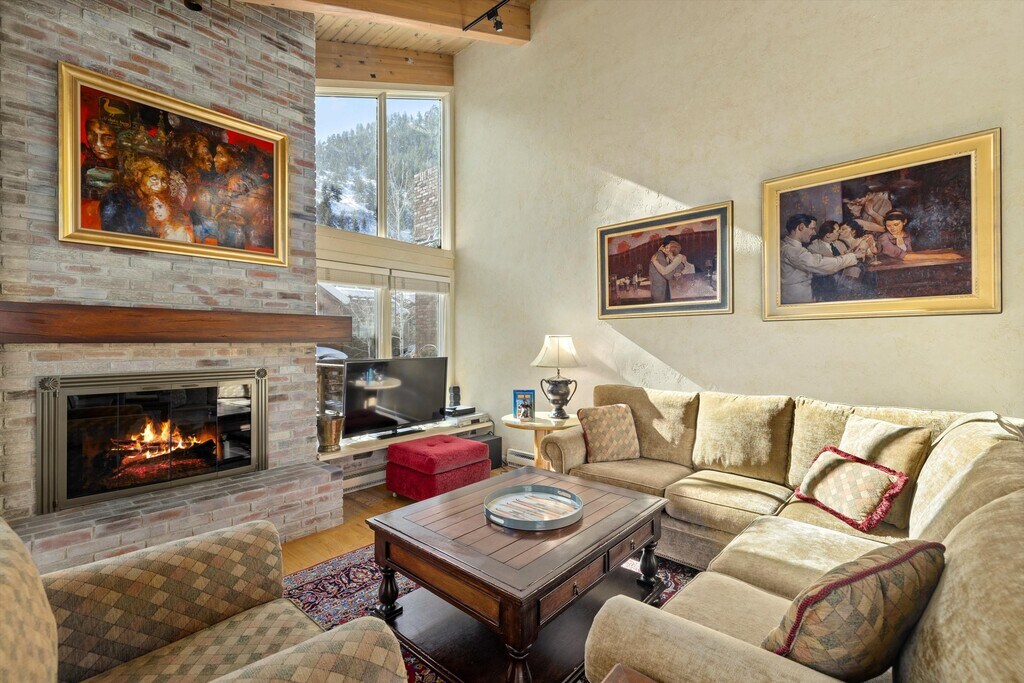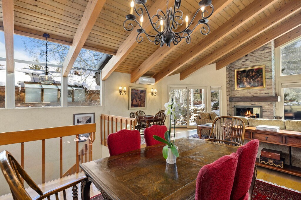 This 3-bedroom, 3-bathroom, two-level townhome, just under 2000 square feet, is ideally situated just 3 blocks from the center of town in the coveted West End. On a quiet street, this home offers 16-foot ceilings and south-facing views of Aspen Mountain from its spacious living area. All three bathrooms have been remodeled with radiant heated floors, and the primary bathroom features a luxurious steam shower. The primary bedroom and one guest room are located downstairs, while the second guest room is upstairs. Mini-split A/C units in the upstairs living room and second guest room ensure comfort, with the downstairs bedrooms staying naturally cool. The home captures morning light through its east-facing windows and includes a south-facing deck that provides unobstructed views of Aspen Mountain, ideal for summer barbecuing. The yard is completely fenced in, adding to the privacy and security of this property. This duplex offers the feel of a single-family home, promising an unforgettable stay in the Aspen area. #095300