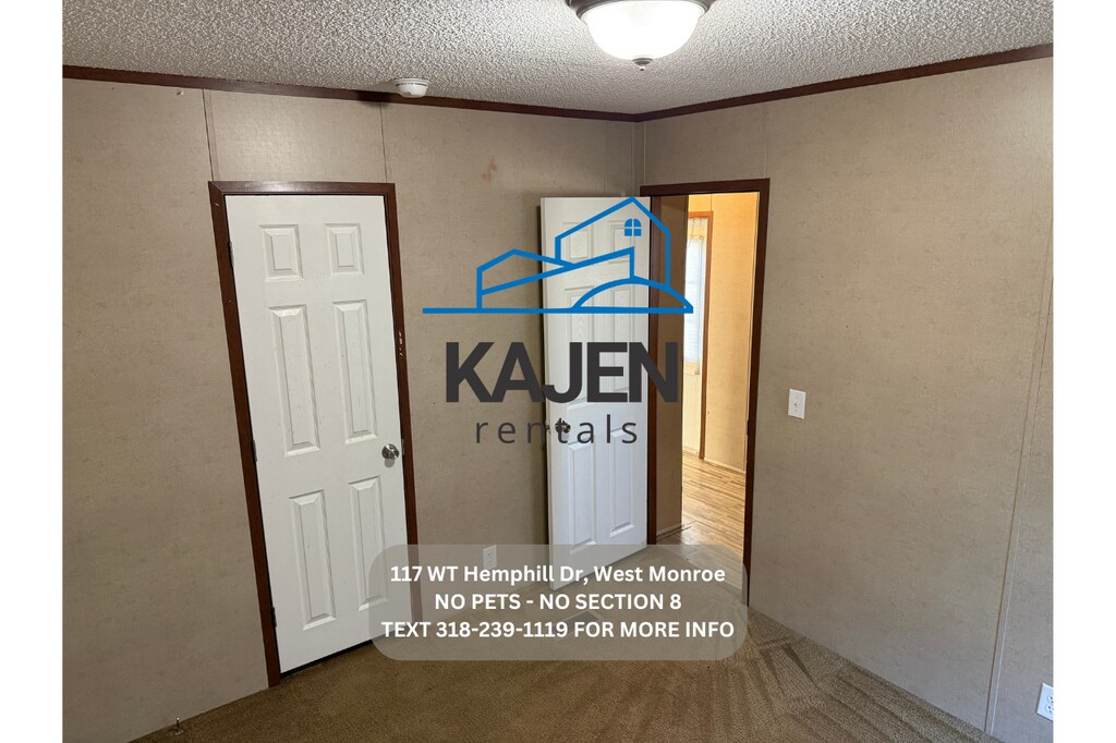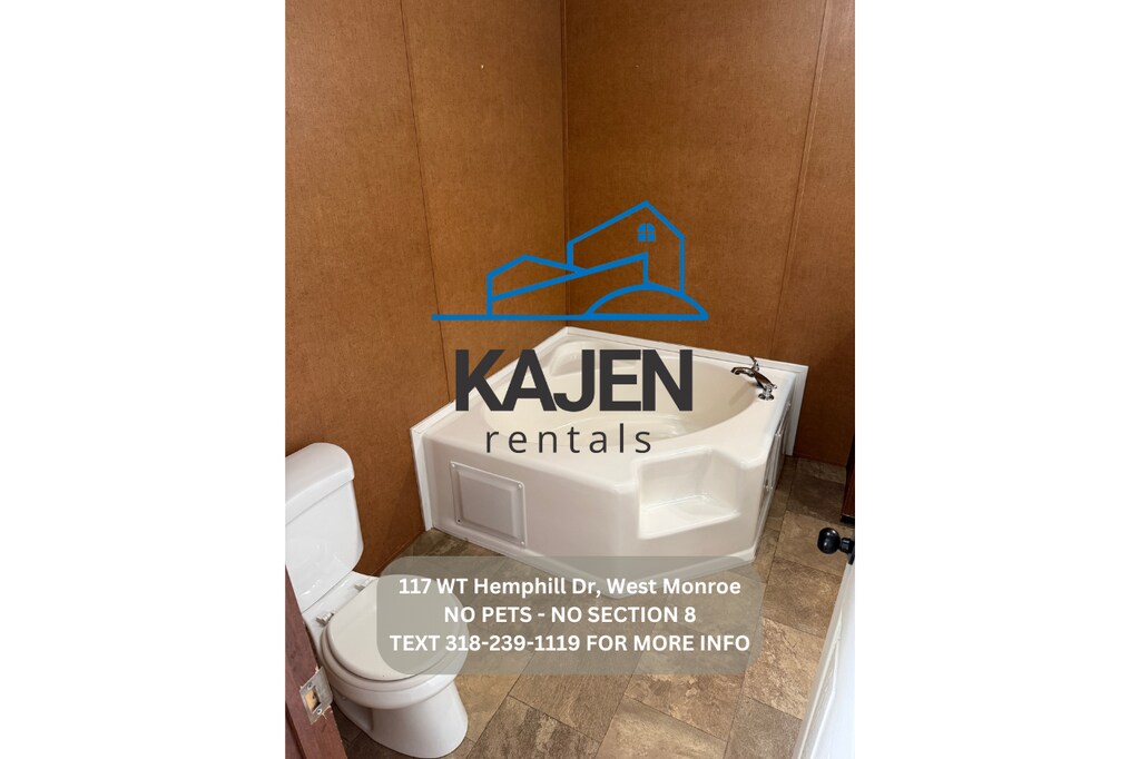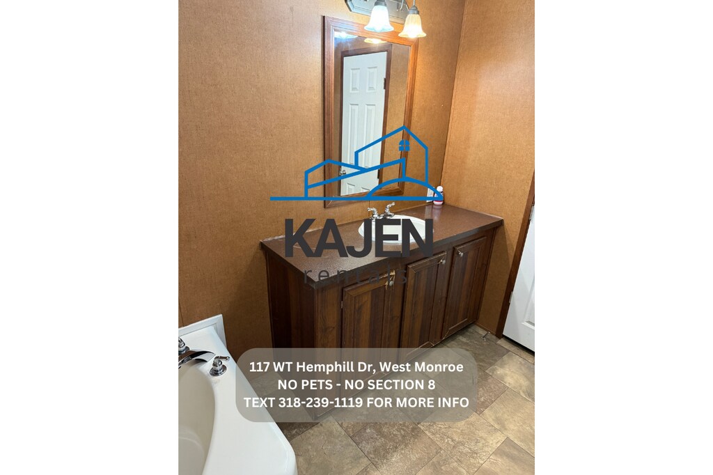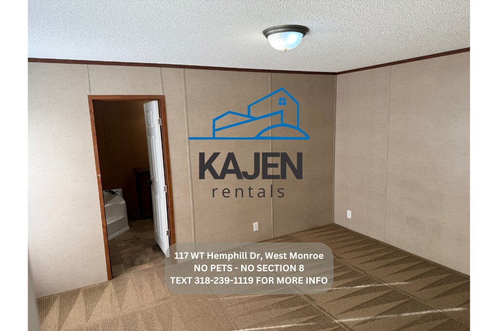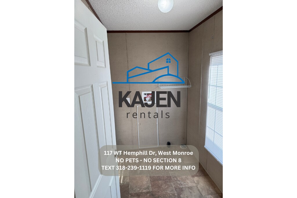 -Text "viewing instructions 117 WT" We will then send you the instructions to do a self showing. -Located next to "The ARC" Church/School. -No Section 8 -No Pets -No rent to own -No smoking inside -Rent is $875.00 -Deposit is $700.00 -Income will be verified on each tenant. -Central Heat and AC. -Located at 117 WT Hemphill Dr West Monroe. -We provide stove, refrigerator, and dishwasher. -3 bedroom 2 bath. -You pay (water, electric) -We pay (trash, mowing) -Home is all electric. -Washer and Dryer connections. -$50 application fee per adult.