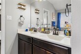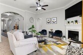 Thoughtfully designed with a versatile one-and-a-half-story layout, this home blends open-concept elegance with everyday functionality. The bright and airy main level offers a spacious living area filled with natural light, seamlessly connecting to the gourmet kitchen—complete with plenty of cabinetry, granite countertops, a large walk-in pantry, and a nice size island with barstool seating that’s perfect for casual dining or entertaining. Retreat to the luxurious primary suite, split from the secondary bedrooms on the main floor, featuring a relaxing spa-like bathroom with a garden tub, separate shower, dual vanities, and a generous walk-in closet. The secondary bedrooms are conveniently located toward the front of the house, along with a dedicated utility room and a stylish guest bath. Upstairs, a large game room offers additional versatility, ideal for a media room, home gym, or creative workspace. Step outside to enjoy a covered patio overlooking the lush backyard, creating the perfect setting for quiet evenings or weekend gatherings. Residents of this sought-after neighborhood enjoy access to community pools, playgrounds, and scenic walking trails, all just minutes from Hidden Cove Park and Lake Lewisville. Experience comfort, convenience, and timeless style in one exceptional Frisco home.