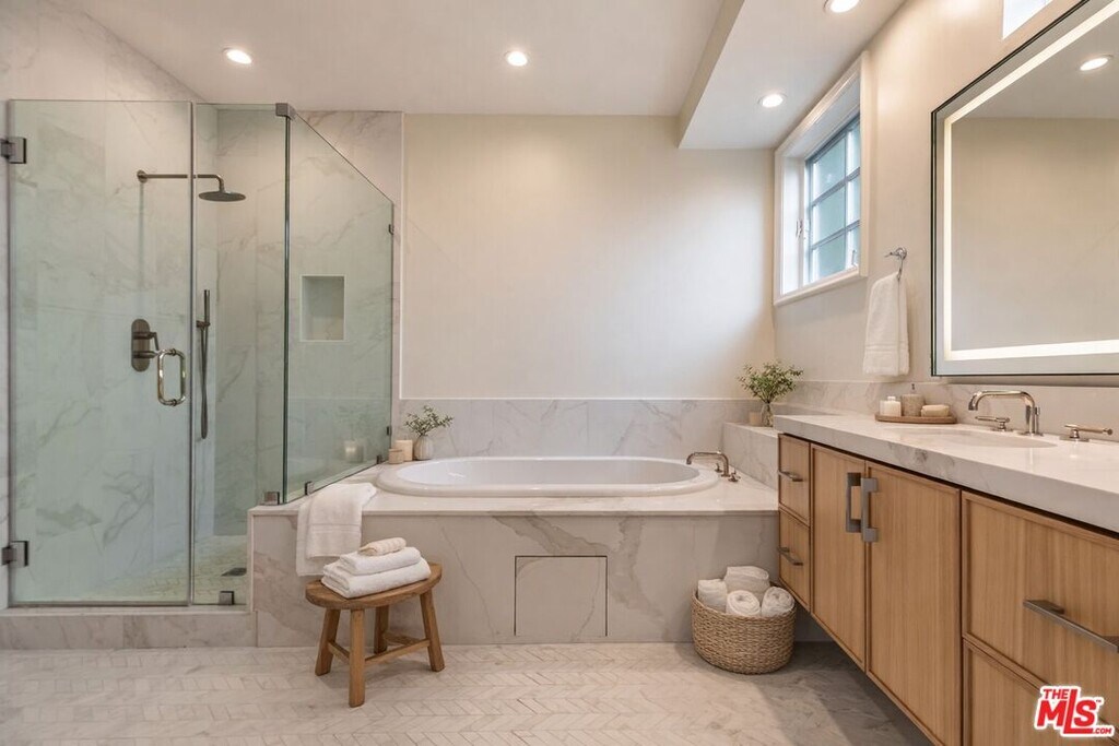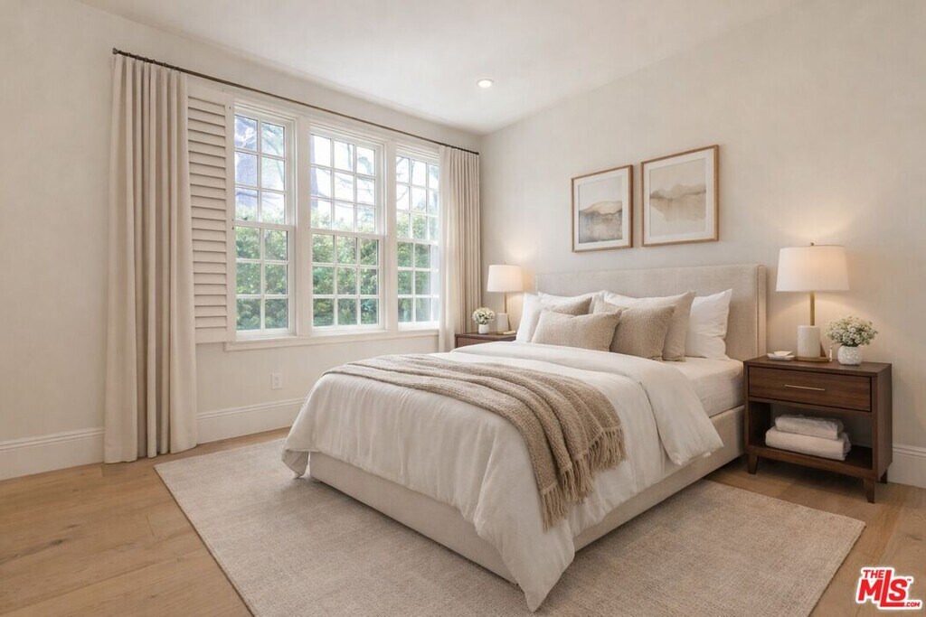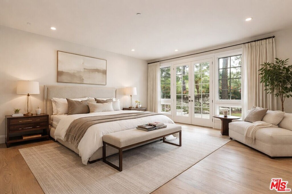 Set within the exclusive, privately gated enclave of Bel Air Crest, this recently upgraded residence offers refined living with thoughtful modern enhancements. At the heart of the home is a newly designed gourmet chef's kitchen, appointed with premium Wolf appliances, dual ovens, a Thermador refrigerator, and a 30-bottle wine refrigerator seamlessly connected to an elegant and spacious great room ideal for entertaining and everyday living. New hardwood floors flow throughout, while expansive windows fill the living spaces with natural light, accentuating soaring ceilings and an airy ambiance. The main level includes a private guest suite with full bath and a dedicated laundry room with sink. Downstairs, the serene primary suite features a generous walk-in closet, a beautifully appointed bathroom, and direct access to the backyard patio surrounded by mature trees and lush landscaping. Two additional full-size bedrooms (optional den) offer flexible space for guests, a home office or playroom, each with built-in cabinetry. HOA amenities include a private clubhouse with fitness center, tennis and basketball courts, putting green, and a resort-style pool and spa, along with a playground, dog park, scenic trails, and 24/7 security patrol. MLS# 26663133
