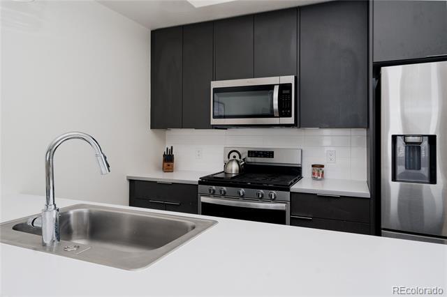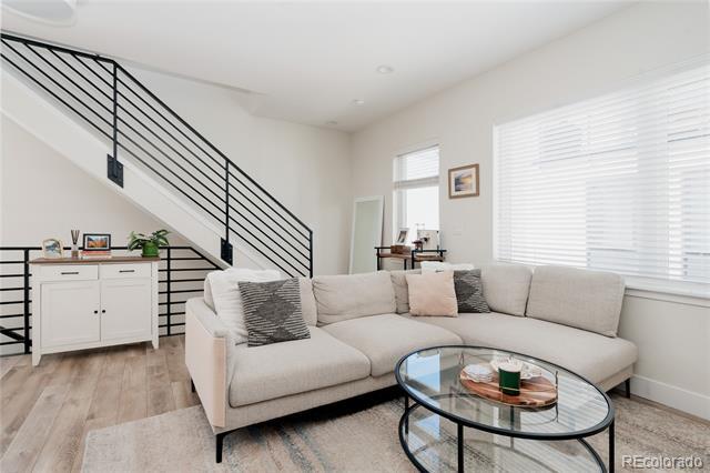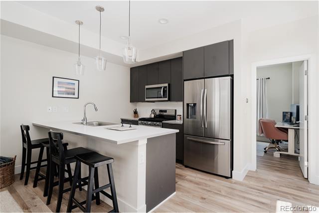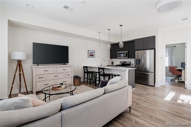Welcome to Parkview Residences, where modern design meets easy Lakewood living. This end unit townhome is filled with natural light and thoughtfully designed spaces that make everyday life feel just a little more elevated. From the moment you walk in, you’re greeted by a functional entry way and drop zone just off the attached two car garage. Upstairs is where the home really opens up. The home features hard surface flooring throughout and large windows that pour in natural light all day long. The kitchen is sleek and modern with stainless steel appliances, generous bar seating, and plenty of space to gather. Whether you’re hosting friends, opening a bottle of wine, or just making a quick weeknight dinner, this space makes it easy. The living room flows effortlessly from the kitchen, creating a bright and comfortable entertaining space that feels both stylish and relaxed. You’ll also find an additional bedroom and full bathroom on this level with a tub and shower. Perfect for guests, a home office. Head upstairs to your private retreat. The primary suite offers a peaceful space to unwind with double sinks and a closet that deserves a moment of appreciation. Laundry is conveniently located on this floor too. Don't forget to step outside to your private deck with mountain views — perfect for morning coffee, sunset drinks, or just taking a minute to relax. Modern finishes, thoughtful design, and low maintenance living all wrapped into one beautifully designed home in the heart of Lakewood. Close to parks, trails, shopping, dining, and easy access to both downtown Denver and the mountains. Easy living, great design, and a little Colorado magic. Townhouse MLS# 2644375