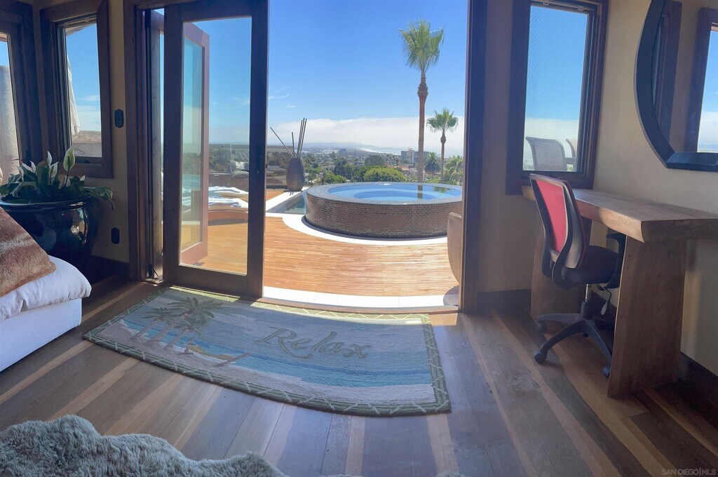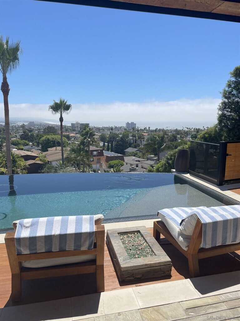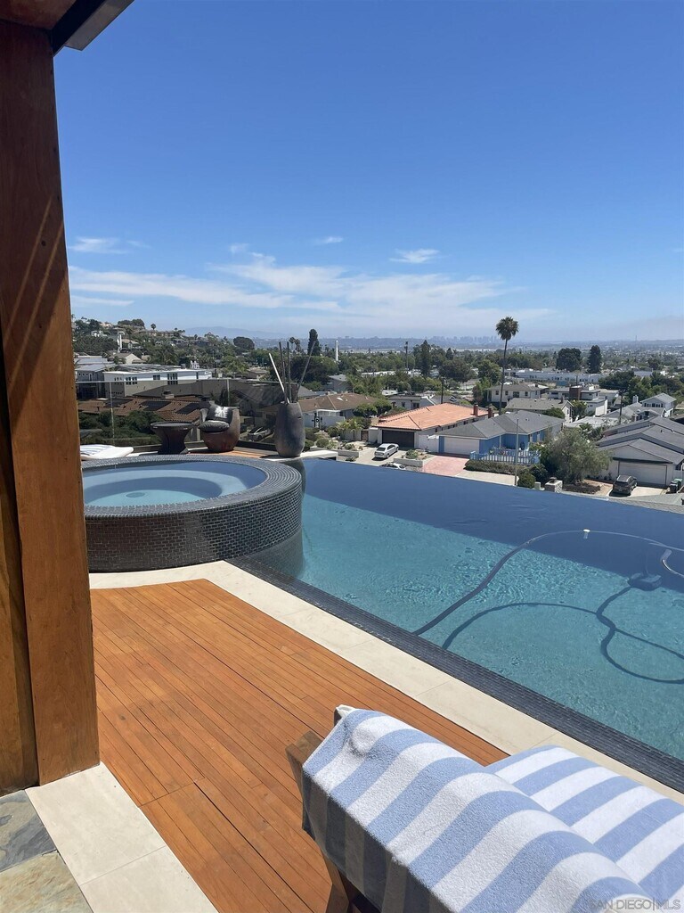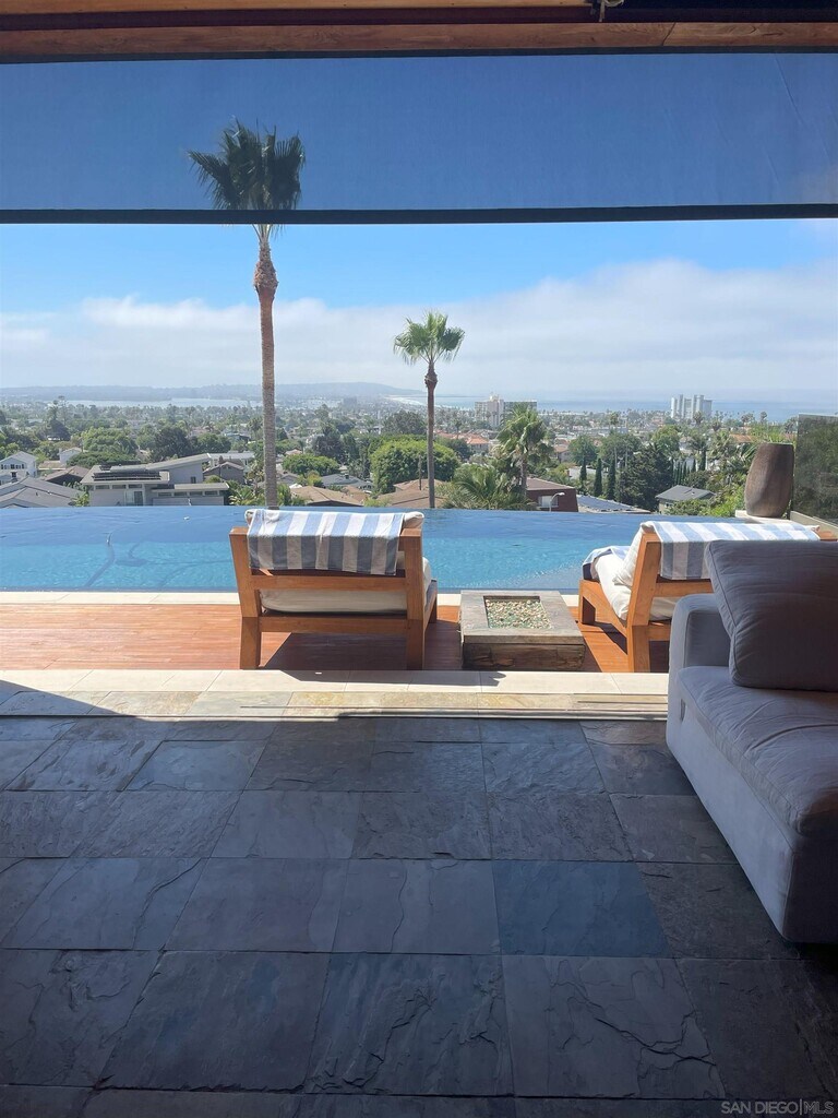 Your private resort awaits! This stunning 4 bedroom,4 and 1/2 bath home is neslted in one of San Diego's most coveted hilltop neighborhoods offering breathtaking 180 degree south west facing views of the Pacific Ocean,Mission Bay,Downtown and all the way to Mexico! Enter into your new home overtop a bridged koi pond and open the Polenysian inspired entrance into the open entertainer's great room and Kitchen. In front of you will be 20 foot sliding glass wall where your infinity edge pool & Spa await you. Other features of this resort inspired home are; Sauna,two steam showers,Putting Green,Custom Wine Closet,Saltwater Fish Tank,Full weight rack in the Garage. This property comes fully furnished with high end pieces from Restoration Hardware. MLS# 250034879