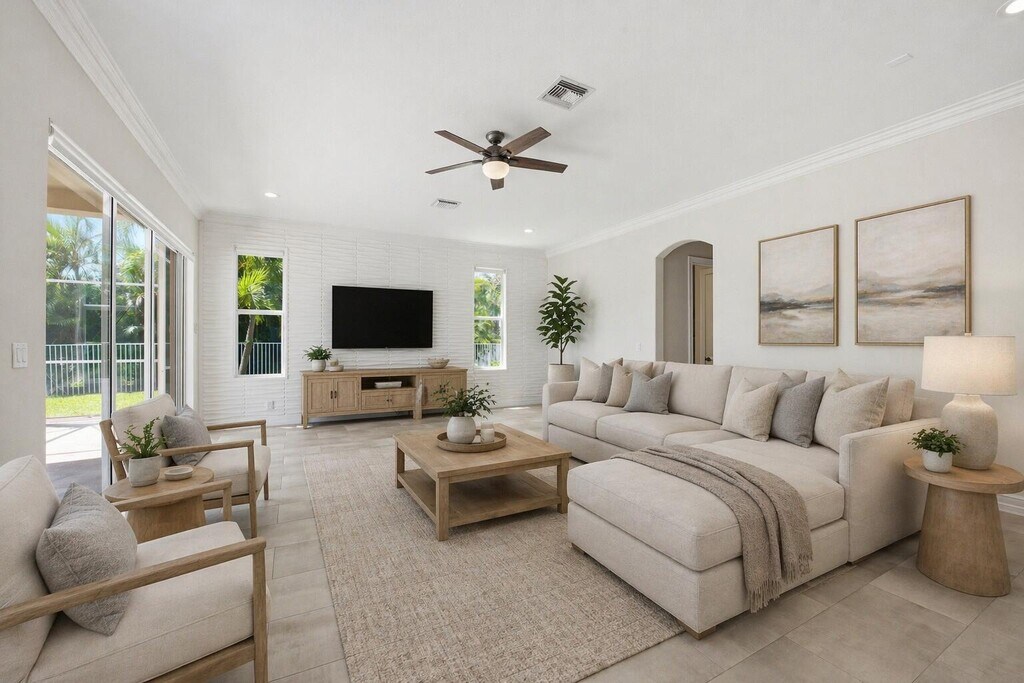 Set on a beautiful lakefront lot in the highly sought-after Isles of Wellington,this exceptional pool home delivers space,style,and a true resort lifestyle. A dramatic two-story foyer welcomes you in,highlighted by a striking wrought-iron staircase,formal living room,and an abundance of natural light that fills the home. The kitchen is designed to impress with sleek quartz countertops,a center island with waterfall edge,decorative tile backsplash,stainless steel appliances,a menu desk,spacious breakfast nook,and a large walk-in pantry. The adjoining family room features a custom paneled accent wall and sliders that open seamlessly to the outdoor living spaceperfect for entertaining. A dedicated movie room offers the ultimate in-home theater experience,while a second primary suite with an attached office/den and ensuite bath provides ideal flexibility for guests or multi-generational living. Upstairs,the primary suite is a private retreat with double-door entry,sitting area,morning bar with mini fridge,tray ceiling,and private balcony overlooking the lake. Two custom walk-in closets complete the space,while the luxurious bath features a jetted tub,walk-in shower,granite countertops,and framed mirrors. A versatile loft and solid wood doors throughout enhance the home's quality and functionality. Step outside to your own backyard oasiscomplete with a custom pool,decorative rock waterfall,spa,tiki hut with bar,outdoor speakers,and a screened enclosure. The fenced yard and side yard offer additional space,all set against serene lake views. This is South Florida living at its finestprivate,upgraded,and built for both relaxation and entertaining. MLS ID B26019419