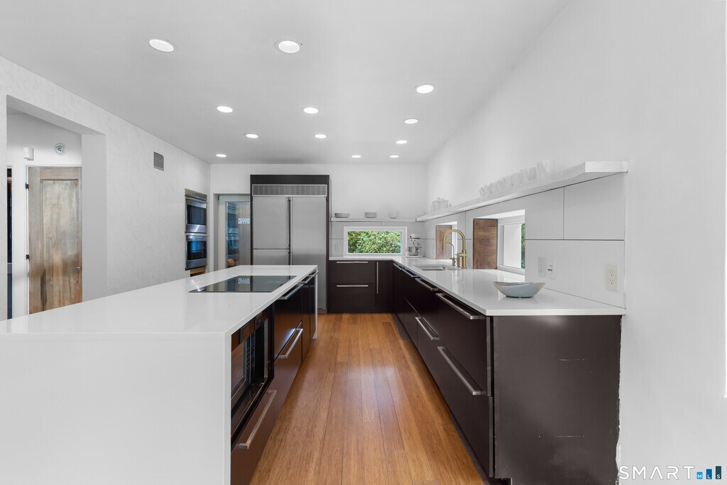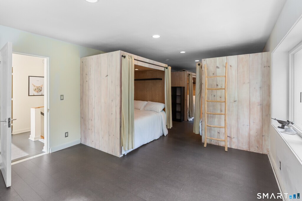 Call for Availability - This Westport residence is a meticulously executed Passive House retrofit of a modernist concrete home originally built in 1938. Few properties achieve this level of energy efficiency while also prioritizing non-toxic, health-conscious building materials. As you pass through the home's front entry gate and hear the gentle rhythm of tires over gravel, a striking and handsome facade comes into view-an arrival that feels both intentional and memorable. The setting immediately conveys a sense of privacy, character, and architectural distinction. Your attention is naturally drawn to one of the most distinctive features of property: the Frazier Peters outbuilding. Rich in charm and architectural interest, this versatile structure offers exceptional flexibility-equally suited as a private office, creative studio, retreat, or state-of-the-art gaming lounge. The space adapts effortlessly to your vision and lifestyle Originally designed by Frank Lloyd Wright protege Francis Barry Byrne, the home is a masterwork of form, function, and sustainability. Proportioned according to the Golden Ratio and set high atop a hill, those who visit cannot help but to enjoy sweeping views of mature rhododendrons and stately oaks. Inside, limestone walls, clean architectural lines, and abundant natural light create an atmosphere that feels both striking and serene. MLS# 24169484