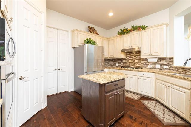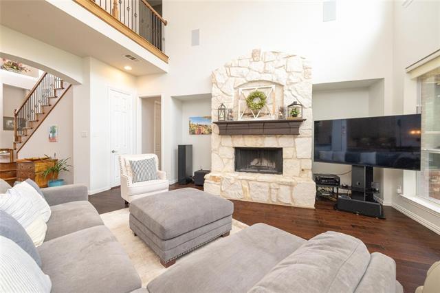 Nestled in the sought-after Lakeview at Point Vista community, this 4-bedroom, 2-story home offers a rare blend of comfort, privacy, and outdoor access. Backing to a serene greenbelt and just a short walk from Hickory Creek Park and Lewisville Lake, residents enjoy trails, a community swimming pool, and private boat landing access—ideal for those who appreciate an active, lakeside lifestyle. Inside, the home features vaulted ceilings and a stone fireplace in the main living area, creating a welcoming atmosphere. The kitchen boasts stainless steel appliances, a gas cooktop, an island, and a breakfast bar—perfect for both daily living and entertaining. A den and formal dining room provide additional spaces for work, study, or hosting gatherings. Upstairs, a spacious living area with built-in cabinetry, a dry bar, and a mini-fridge serves as an entertainment hub, while the media room offers a private space for movies or gaming. The generously sized bedrooms provide comfort and privacy for all members of the household. The custom covered patio overlooks a split-level backyard that backs to the greenbelt, offering a peaceful, private setting for relaxing or enjoying warm Texas summer nights. With its thoughtful design, multiple living areas, and access to one of the area’s most desirable communities, this home presents a unique opportunity for those seeking a blend of comfort, convenience, and outdoor enjoyment.