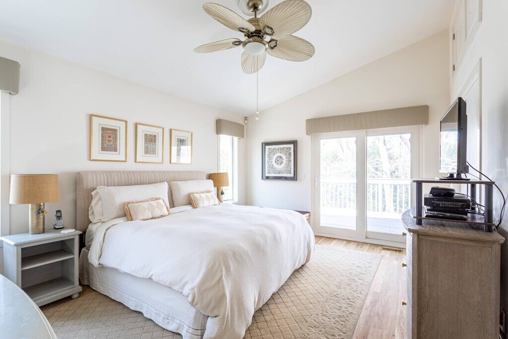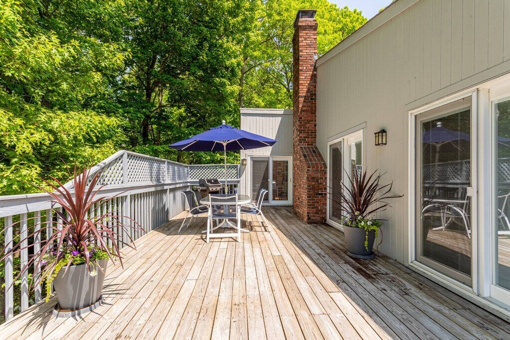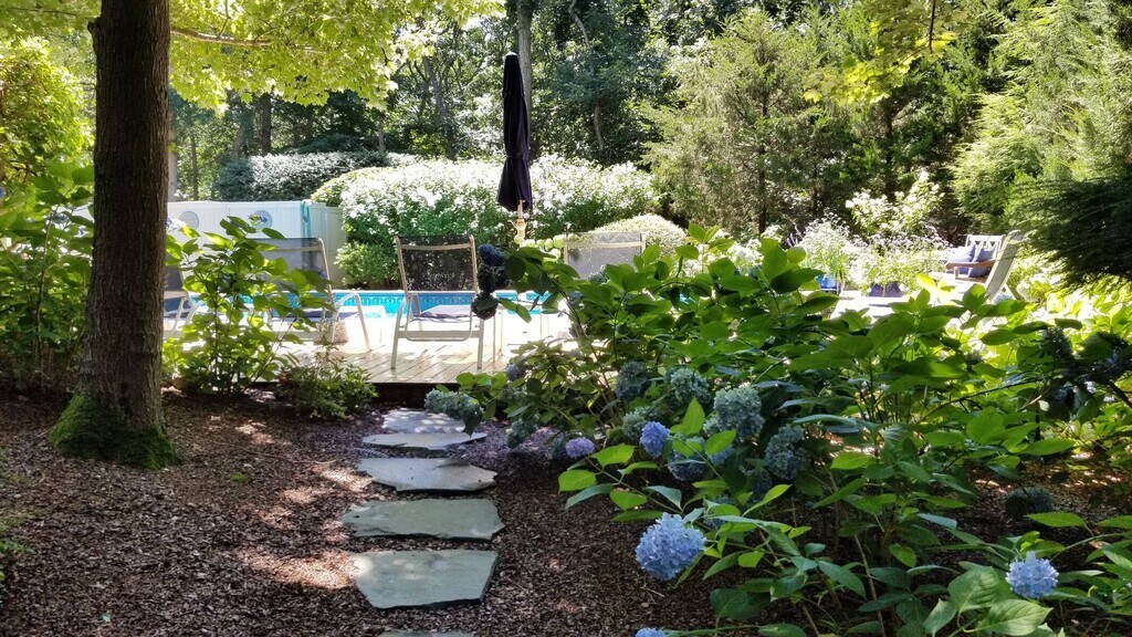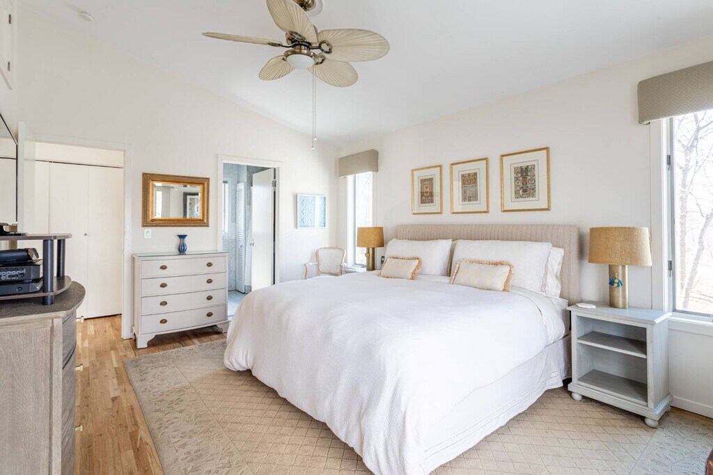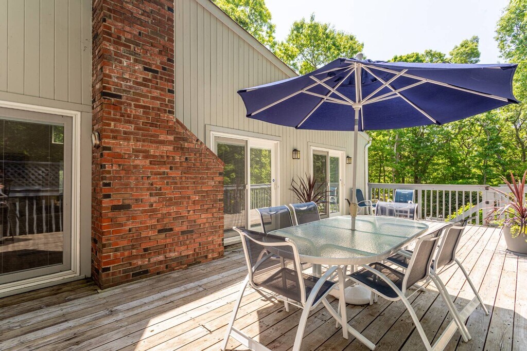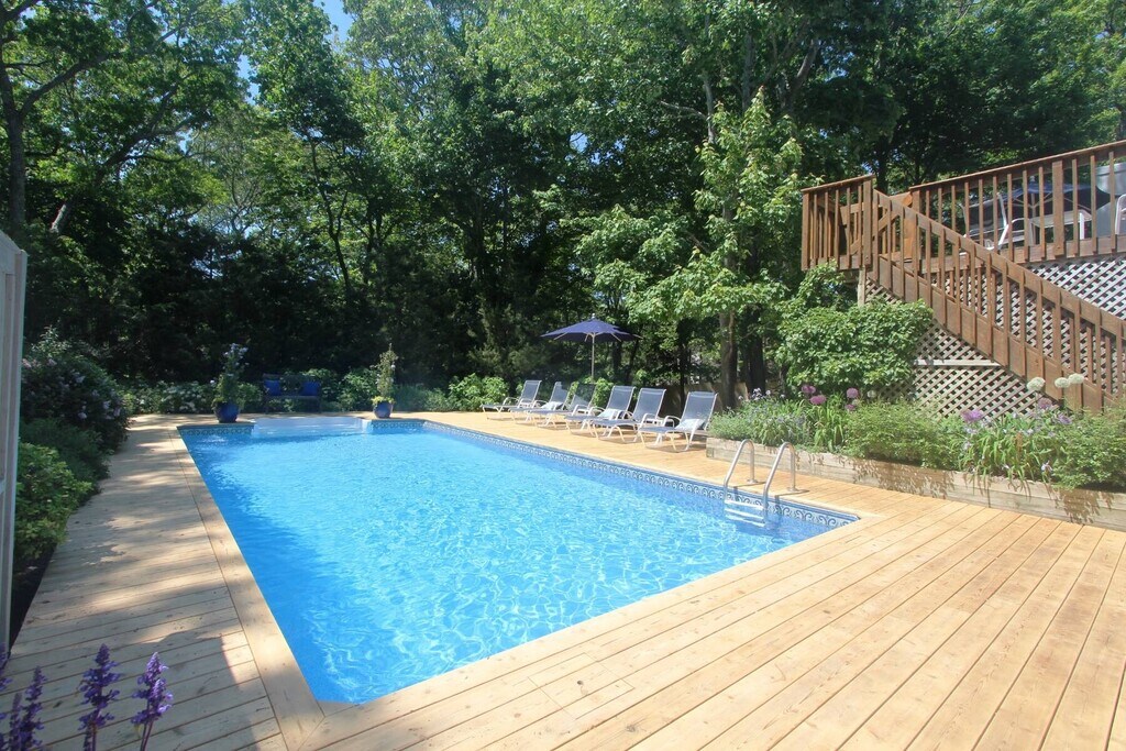 This immaculate home is a one level contemporary located on a private, wooded lot. It is tastefully furnished and has a spacious, sunlit living room with a cathedral ceiling and brick fireplace. The living room is flanked on one side by the private master bedroom suite with king-size bed, en suite marble bath, phone, and TV and on the other side by three additional bedrooms and shared bath. The newly renovated kitchen with skylight has granite counter-tops, stainless steel appliances and terra cotta tile floor. In addition to central air conditioning, the living room and each bedroom has a ceiling fan. The house has a large sunny upper deck, accessed by four sliding glass doors, with comfortable patio furniture and grill, and a sunny lower deck with heated in-ground swimming pool surrounded by beautiful, flowering landscaping and an enclosed outdoor shower. ALL ELECTRIC AND GAS FOR POOL INCLUDED IN PRICING [[Rental Registration # 24-316]] EH RR #: 24-316 Rental Terms: August - Labor Day: $35,000 July: $30,000 Other / Short Term - 5/22/2026 - 6/22/2026: $17,000