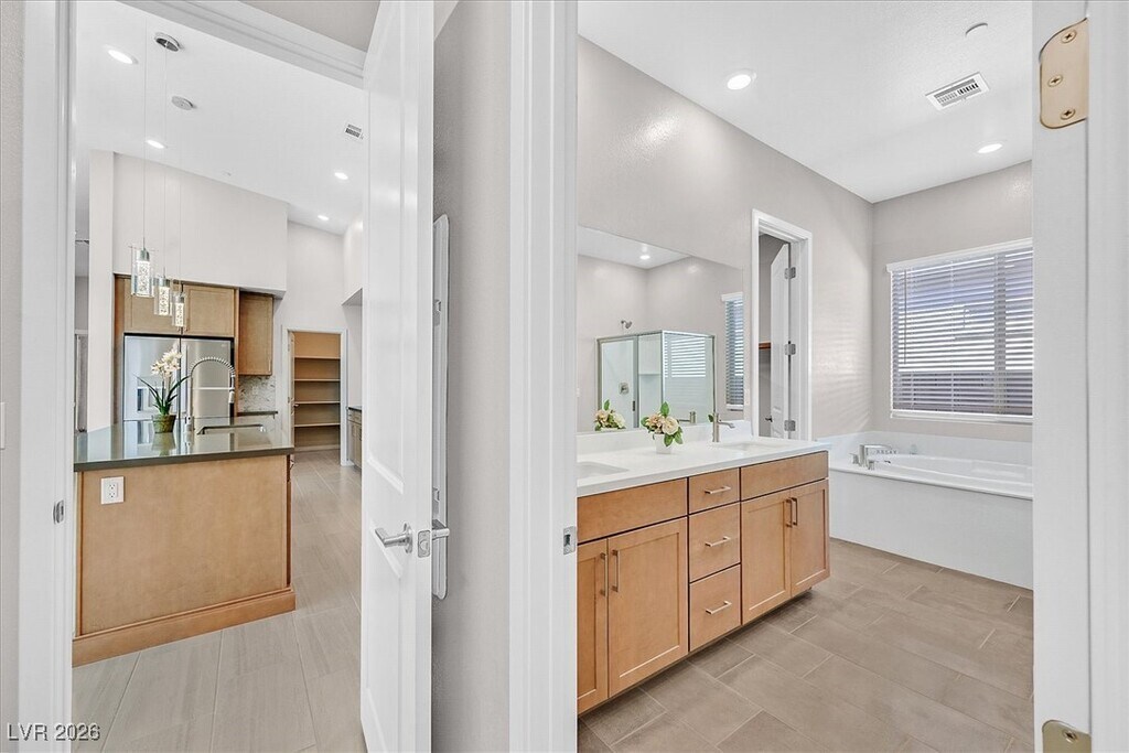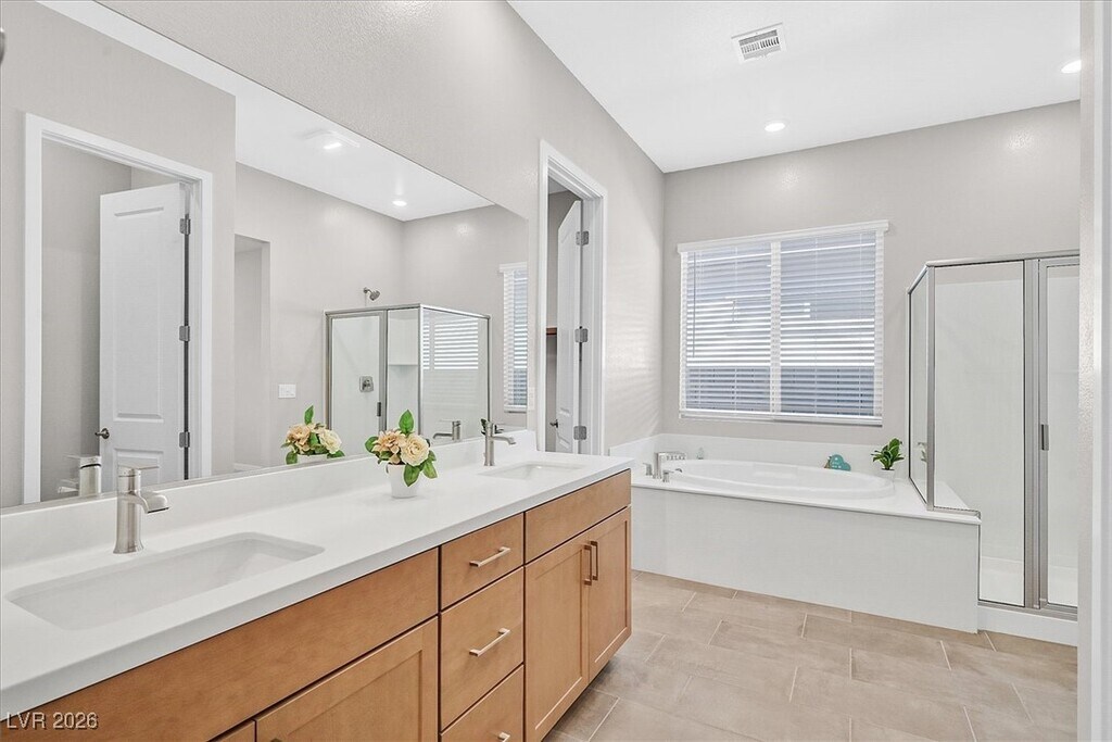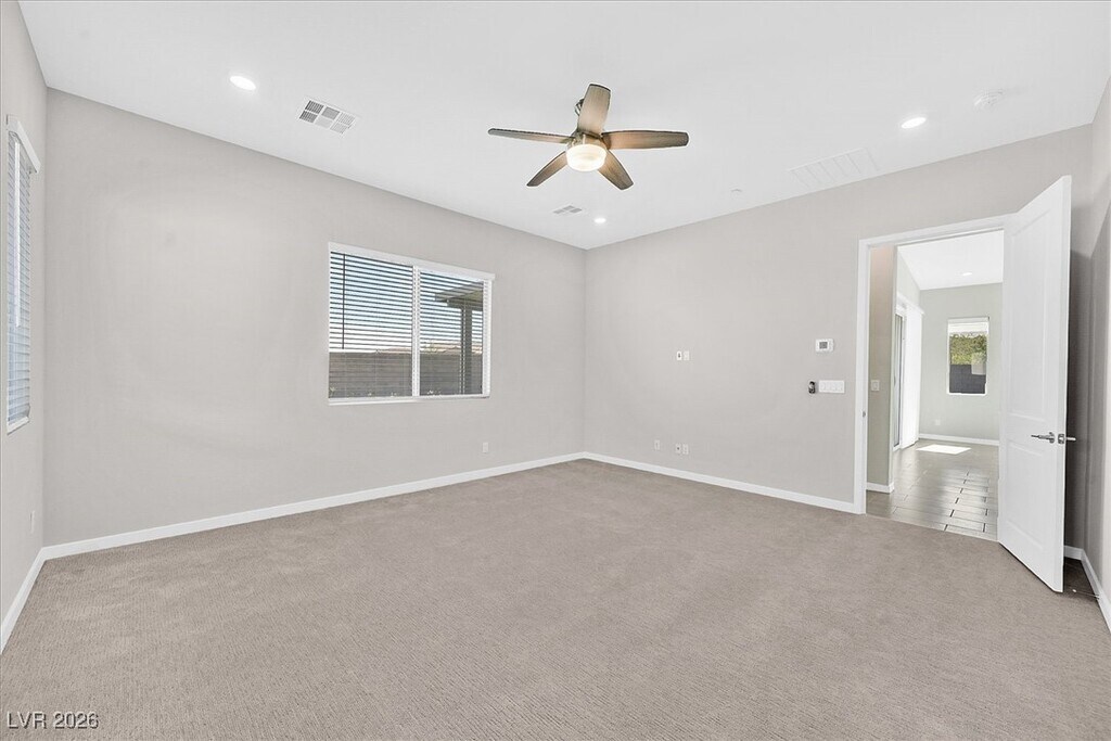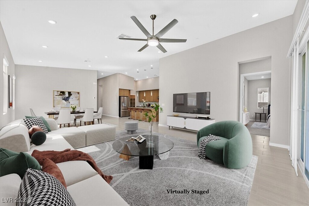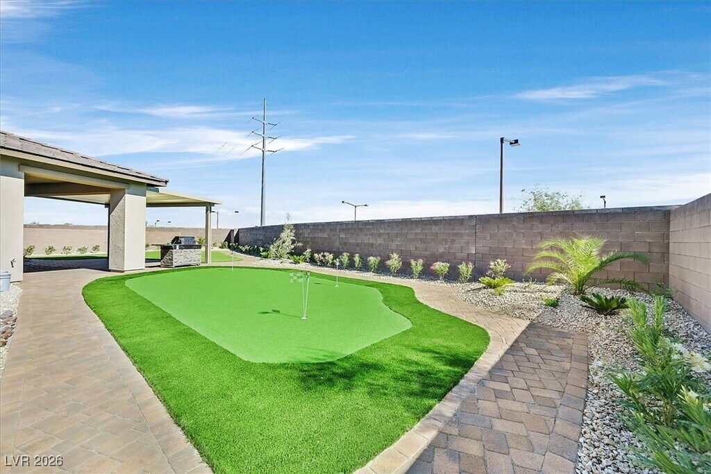 Beautiful 3 bedroom 1 story home in Savannah Community in West Summerlin! completely landscaped backyard with a putting green and pavers, barbecue, covered patio, tandem 3 car garage, epoxy floor in garage, top of the line ceiling fans, modern pendant lighting, front load washer and dryer in laundry room off of master bedroom, one of the largest lots in the community!