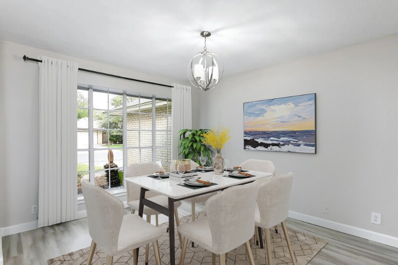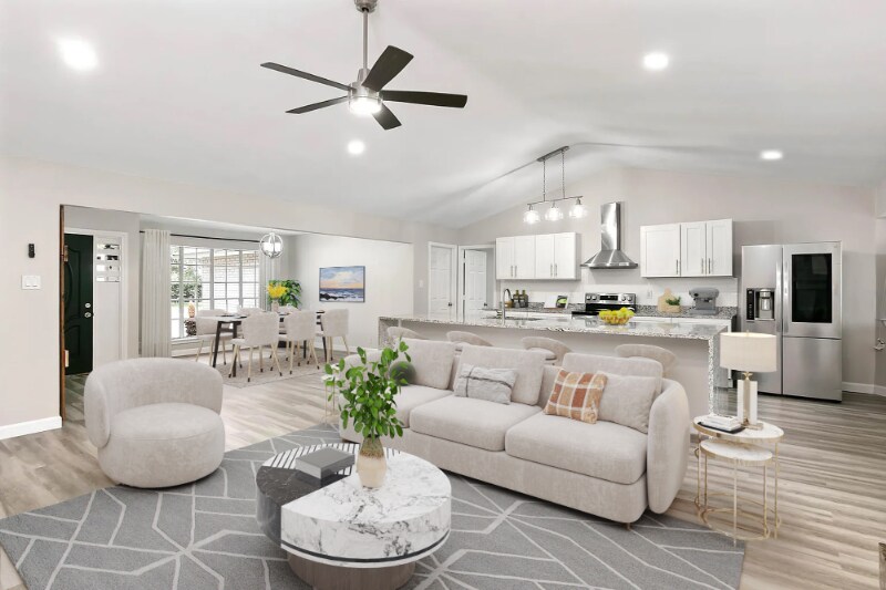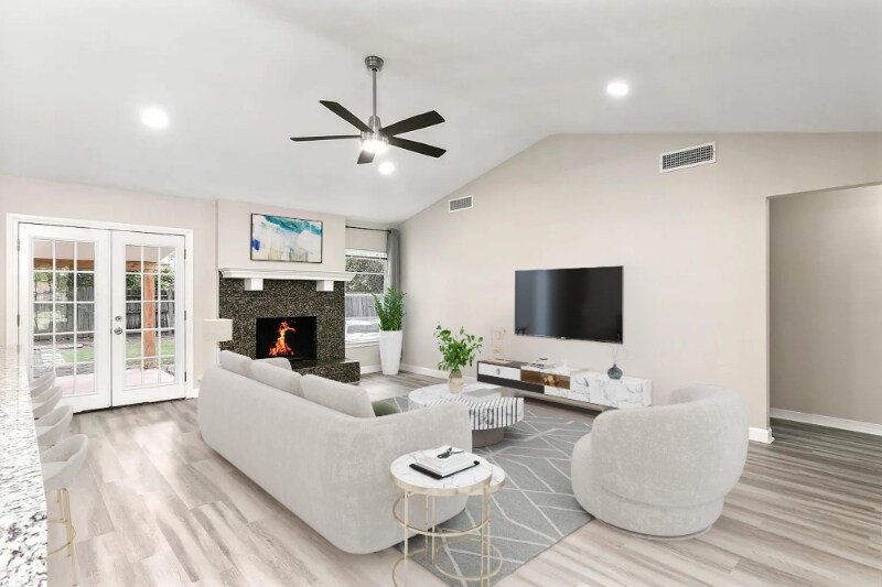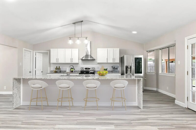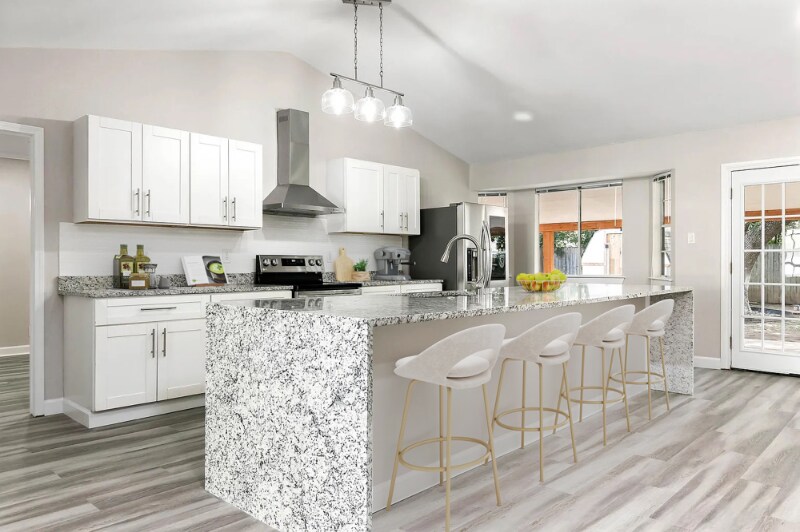 Property Id: 921196 Property features great curb appeal with green grass and large shade tree. Interior features include a BRIGHT and OPEN floor-plan with vaulted ceilings, dining area, & good size family room with fireplace! Beautiful NEW luxury vinyl flooring throughout. Kitchen with ENORMOUS island, NEW granite counters with waterfall, white shaker cabinets, custom tile back splash & NEW LG stainless steel smart appliances! Large primary bedroom with walk-in closet, & NEW recessed lighting. Bathrooms with NEW granite, NEW fixtures & NEW toilets! 3 good size secondary bedrooms. NEW ceiling fans and fixtures throughout! Private back yard with large covered patio PERFECT for entertaining. Freshly painted & move-in ready!