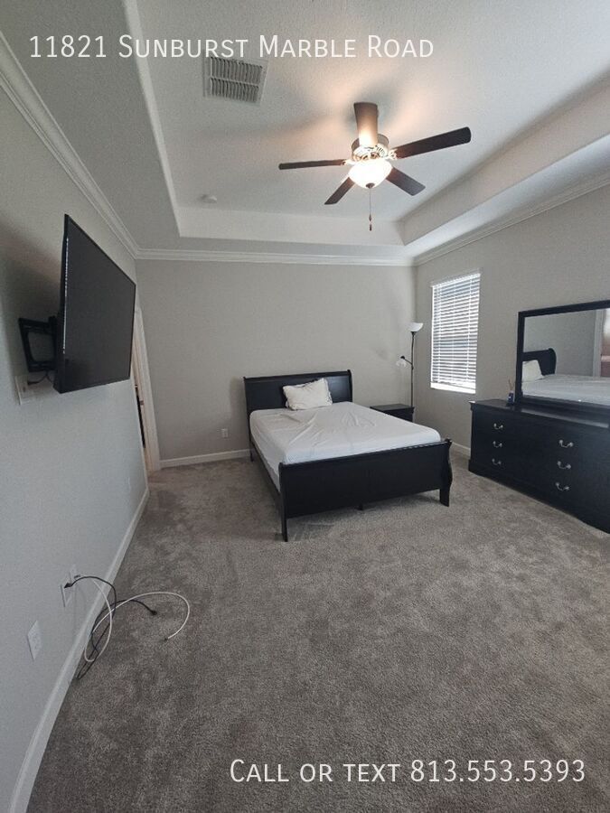 Welcome to this adorable single-story home offering 2,061 sq. ft. of living space and a thoughtfully designed open floor plan perfect for modern living and entertaining. Step inside through the elegant foyer with a tray ceiling, leading you to a bright and spacious great room, dining area, and kitchen that flow seamlessly together. The chef’s kitchen boasts staggered maple espresso cabinetry with crown molding, Caledonia granite countertops, and stainless steel appliances, creating both style and functionality. The luxurious master suite features a spa-inspired bath with dual vanities, granite counters, wood cabinetry, a soaking tub, separate shower, and a huge walk-in closet with convenient access to the utility room — complete with a washer and dryer. Enjoy 18x18 diagonal tile flooring, a 2-car garage, and hurricane shutters for peace of mind. Step outside to your screened-in porch, perfect for relaxing and taking in Florida’s beautiful weather. Located in the desirable South Fork community in Riverview, this neighborhood offers fantastic amenities including a community pool, dog parks, and children’s playgrounds, all included with your HOA. You’re just minutes away from top-rated schools, restaurants, shopping centers (Publix, Walmart), fitness centers, hospitals, and entertainment — everything you need within a 5-minute drive! This home truly has it all — comfort, convenience, and style — ready for you to move in and enjoy! Bonus Option: For just $150 extra per month, this home can also be offered fully furnished — ready for you to move right in and enjoy! Please note: A $60/month Resident Benefits Package (RBP) fee will apply, enhancing your experience with added convenience and support services. None