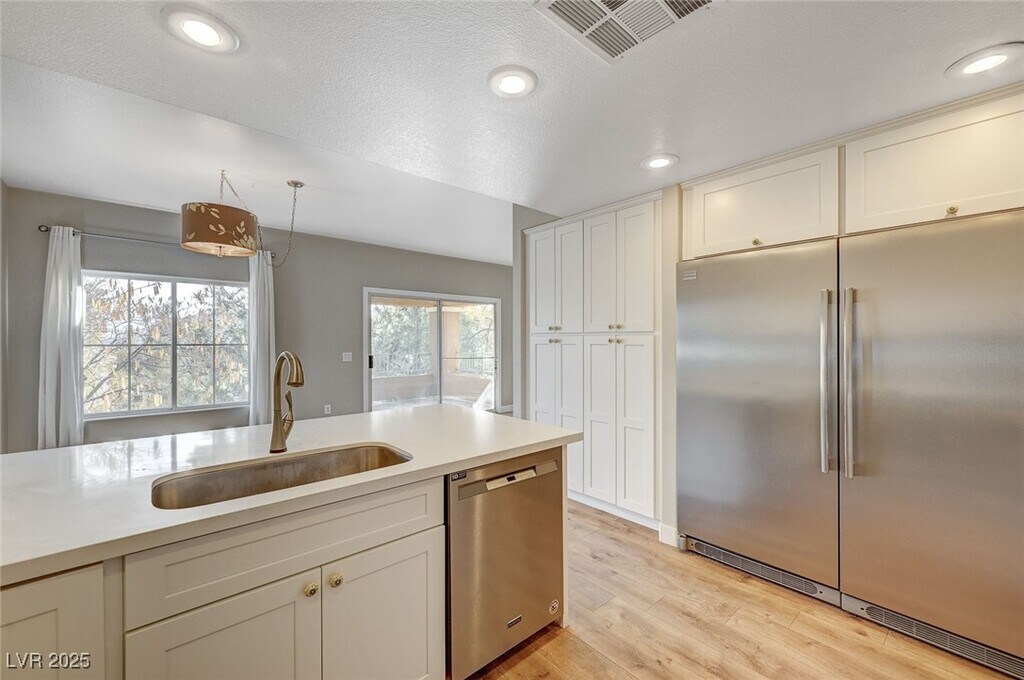 Gorgeous 2 bed + den 2nd story condo that sits above a 2 car garage. Great room with modern fireplace that opens to a spacious balcony. Ceiling fans, two tone paint, upgraded kitchen & bathrooms. Quartz counters, subway tile back splash, breakfast bar, and custom cabinets. Master bath with large soaking tub, separate shower, double sinks and radiant floor heating. Gated community with tree-lined streets in an area of Summerlin that's easily accessible to the freeway, shopping and entertainment.