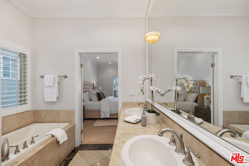 This refined elegant building is located near renown shops and restaurants in the heart of Brentwood. The luxurious single story condo features a formal entry leading to an expansive, light-filled living room/dining area lined with high ceilings, crown moldings, hardwood floors and a stone fireplace. The gourmet kitchen is equipped with custom made cabinets, granite countertops and stainless steel appliances. The primary bedroom offers a peaceful retreat with ample closets and a private balcony. The large ensuite bath has a spa-like tub, separate glass enclosed shower and double sinks. The second and third bedrooms have large closets and an adjoining bath, and provide versatile spaces that can accommodate guests or can be used as home office, hobby rooms or fitness areas. In unit laundry, AC, and plantation shutters throughout. Two assigned parking spaces in a secure garage. MLS# 25631243