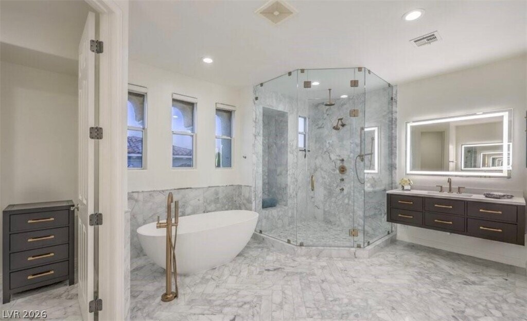 Nestled in the heart of Southern Highlands Golf Club. This prestigious, guard-gated community offers breathtaking views and unparalleled luxury. Step inside this exquisite home and be greeted by herringbone pattern flooring and soaring ceilings. Multiple French doors flood the interior with natural light, revealing a private courtyard featuring a tranquil fountain and cozy fireplace. The gourmet kitchen showcases stunning Carrera marble countertops, while the spa-like primary bathroom boasts luxurious Brizo fixtures. With five bedrooms, each featuring its own en suite bathroom, this home provides ample space for comfortable living. Two attached casitas offer additional privacy and versatility. Enjoy the breathtaking golf course and mountain views from the upper deck fireplace lounge or relax by the oversized pool. The expansive outdoor space and oversized lot complete this exceptional property. MLS ID 2775397