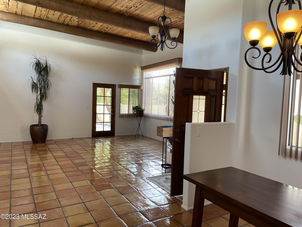 Perfectly private, perfectly maintained charmer featuring Saltillo tile floors, wood beamed ceiling, wood burning bee hive fireplace and LOADS of architectural detail. Natural light abounds in your great room due to the perfect placement of the clerestory windows. Bonus living space is just off of the kitchen, only limitation is your imagination! Private backyard with low care landscaping, covered patio and al fresco patio space. Great opportunity for a container garden. All of this in the vibrant Oro Valley community, featuring shopping, dining, an aquatic center, parks, sidewalks, trails +++!