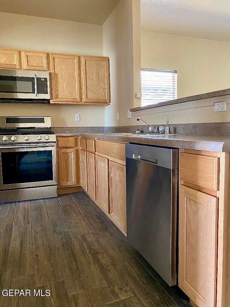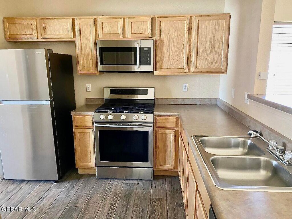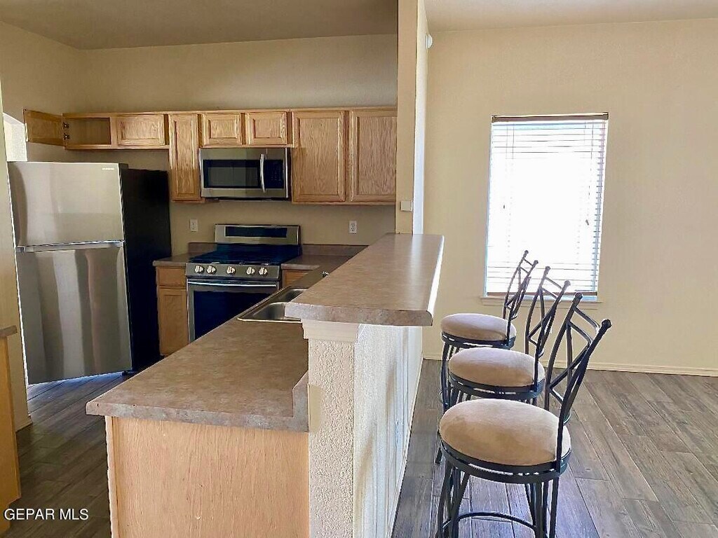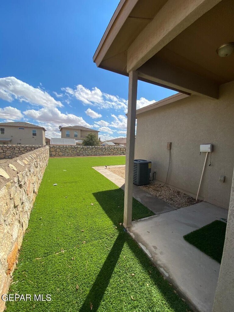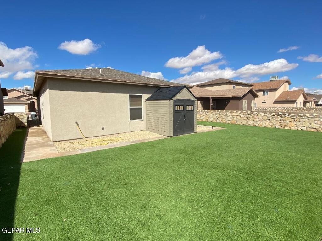 Beautiful home in Mesquite Hills. convenient to both Fort Bliss and McGregor range. Built in 2008,features 3 bedrooms,2 full baths. Complete updated stainless steel kitchen appliance package. Master bedroom has walk-in closet,master bathroom with garden tub,separate shower,his and hers sinks. Large bedrooms with plenty of closet space. Indoor laundry room with washer and dryer included. Carpet only in bedrooms rest of home is all ceramic tile. 2 car garage. Covered patio,good size back yard with maintenance free artificial turf and storage shed. Refrigerated air-conditioned. PMI residents are enrolled in the Resident Benefits Package (RBP)which includes HVAC air filter delivery,utility concierge service making utility connection a breeze during your move-in,our best-in-class rewards program,& more! With renters' insurance.