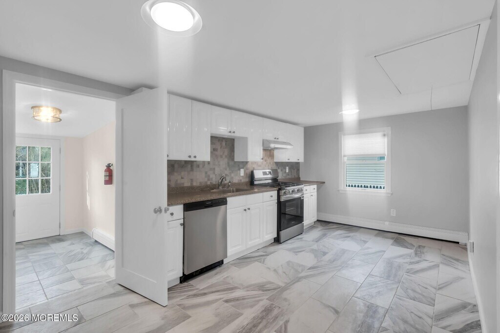 Welcome to this beautifully renovated,spacious and bright ranch just minutes from the Jersey Shore beaches. A nicely landscaped front yard welcomes you to a maintenance-free front porch and into a light-filled layout featuring rich new hardwood floors and freshly painted neutral walls and trim throughout most of the living space. The brand-new eat-in kitchen offers white cabinetry,stone countertops,a full stainless-steel appliance package,and stylish ceramic tile flooring. The great room,highlighted by a new picture window,flows seamlessly into the dining area and kitchen perfect for everyday living and entertaining. The primary bedroom suite features a newly renovated full bathroom with a molded shower enclosure. Two additional bedrooms offer hardwood flooring and ample space,complemented by a second updated full bathroom with a tub. Additional highlights include a new washer and dryer,private driveway parking,and a fenced-in backyard with a paver patio ideal for outdoor relaxing or entertaining. Conveniently located near ferry,train,bus,and major commuting routes. Pets considered and subject to owner approval.