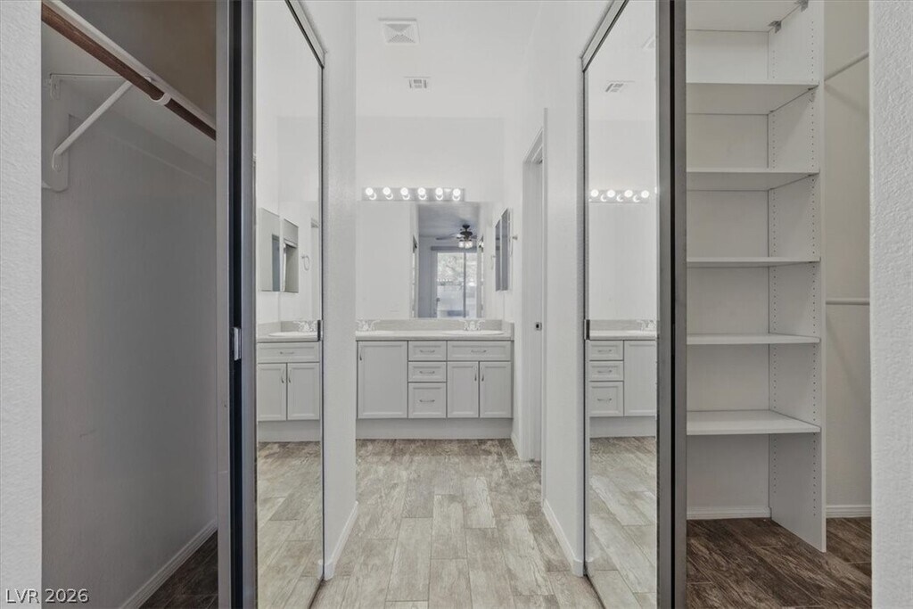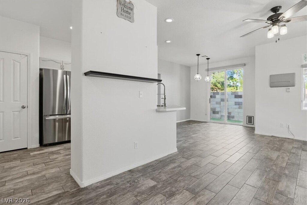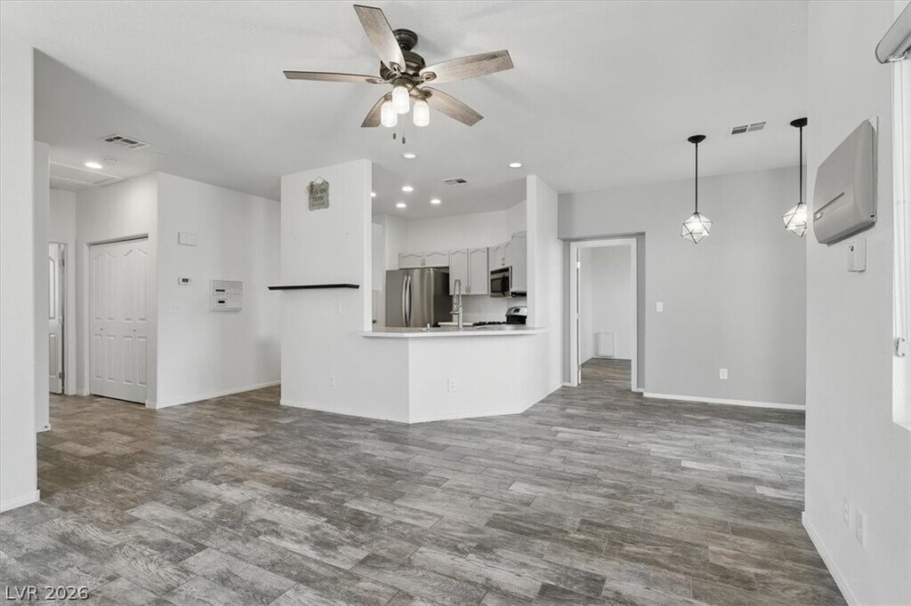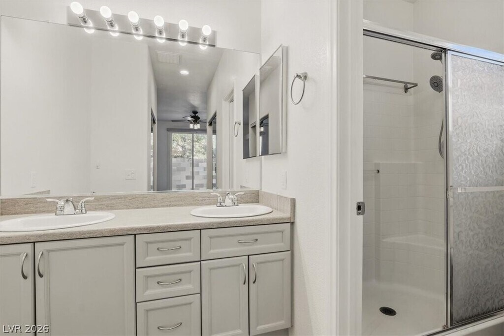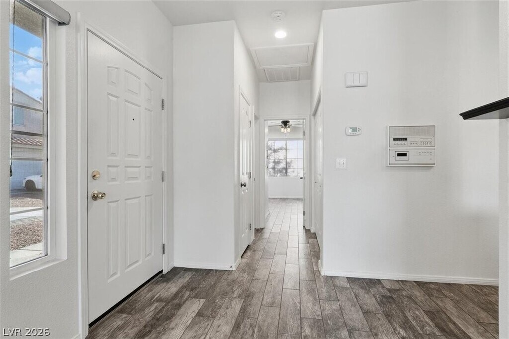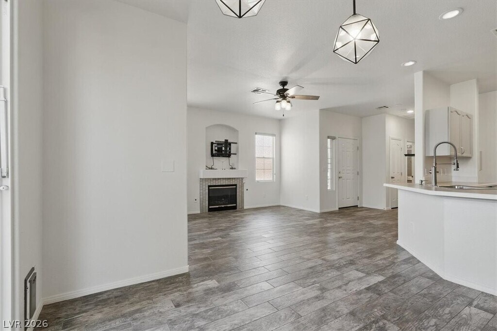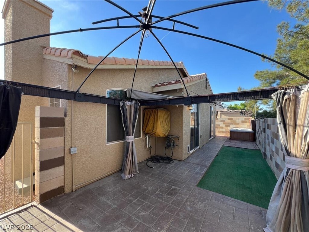 Fall in Love with This Immaculate Single-Story Dream Home in Silverado Ranch! This beautifully maintained home offers a rare layout featuring dual primary bedrooms and an open-concept design flooded with natural light. Relax by the elegant fireplace, or cook with ease in the stylish kitchen outfitted with GE stainless steel appliances. Easy-care wood-look tile flooring runs throughout. The spacious secondary bedroom boasts dual closets and a built-in desk area, while the primary suite features an en suite bath, mirrored double closets, and direct access to the backyard—perfect for enjoying the hot tub. Step outside to your private oasis with stamped concrete, low-maintenance synthetic turf, and a charming gazebo—ideal for outdoor entertaining. The oversized 25’ deep garage includes built-in storage cabinets and an accessible driveway trench plate, offering both convenience and functionality. Pride of ownership shines throughout*Close to shopping, the freeway and the Las Vegas STRIP